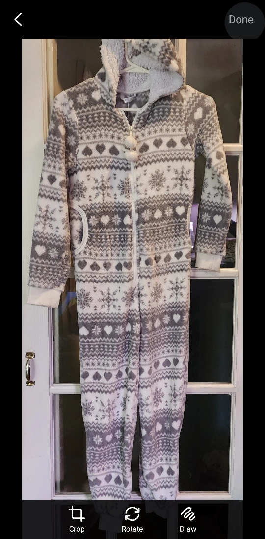 Stay warm and snug in this cute onesie! It's a grey and white colour with a fun pattern of snowflakes and hearts. Perfect for lounging around the house on chilly days!