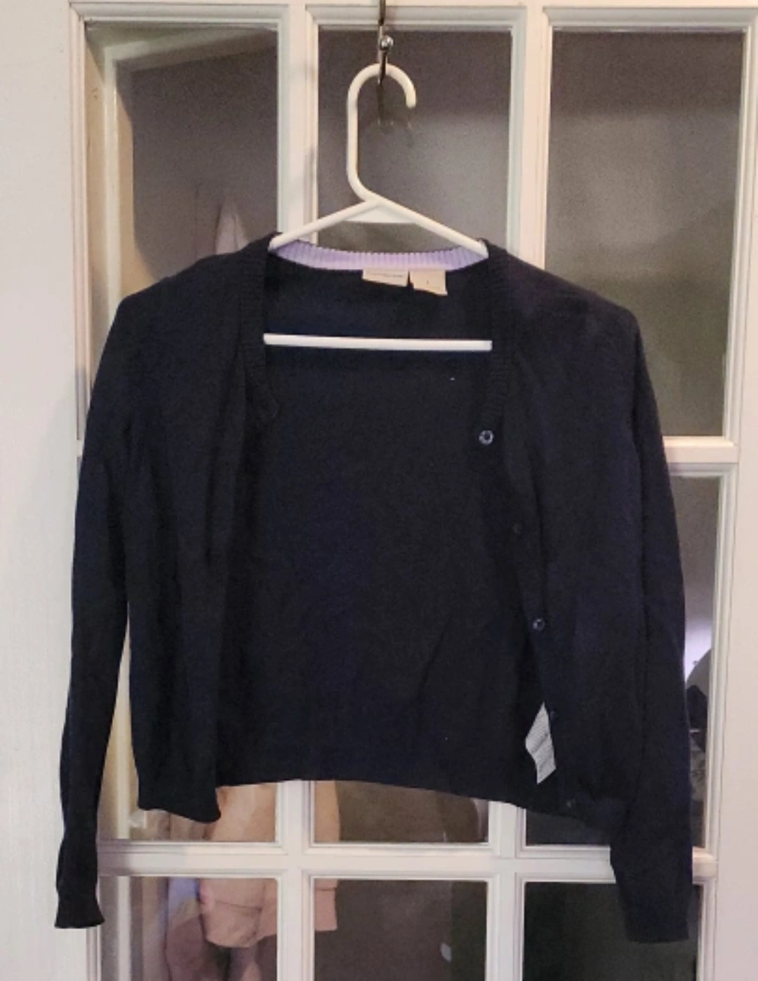 A classic navy blue cardigan. Perfect for layering or wearing on its own. It's in great shape and ready for a new home!