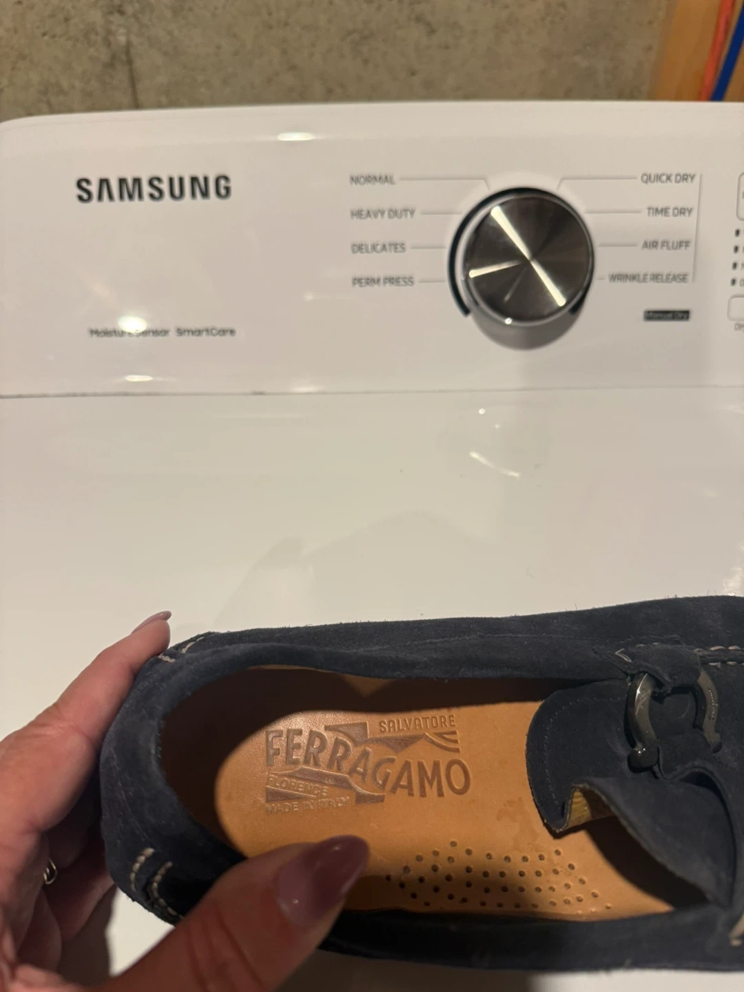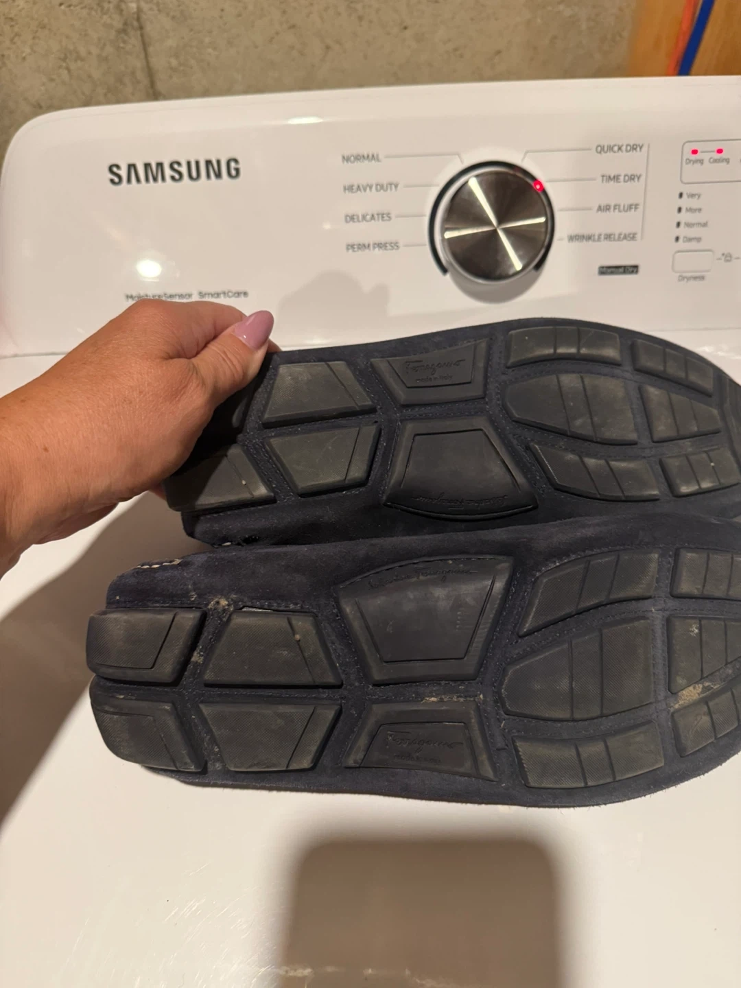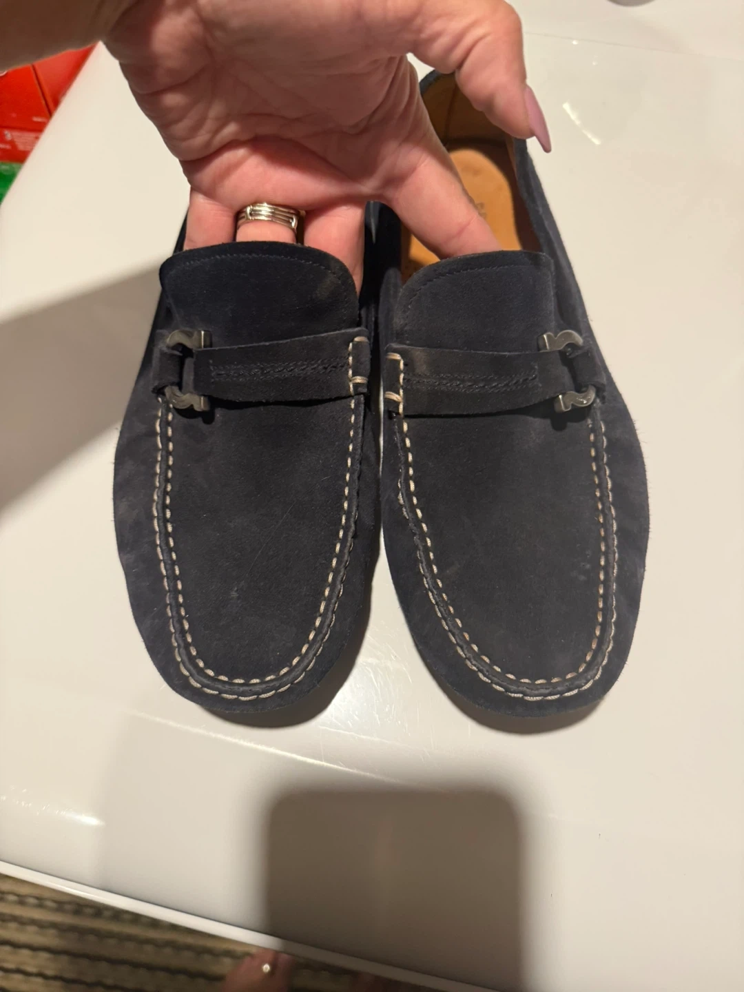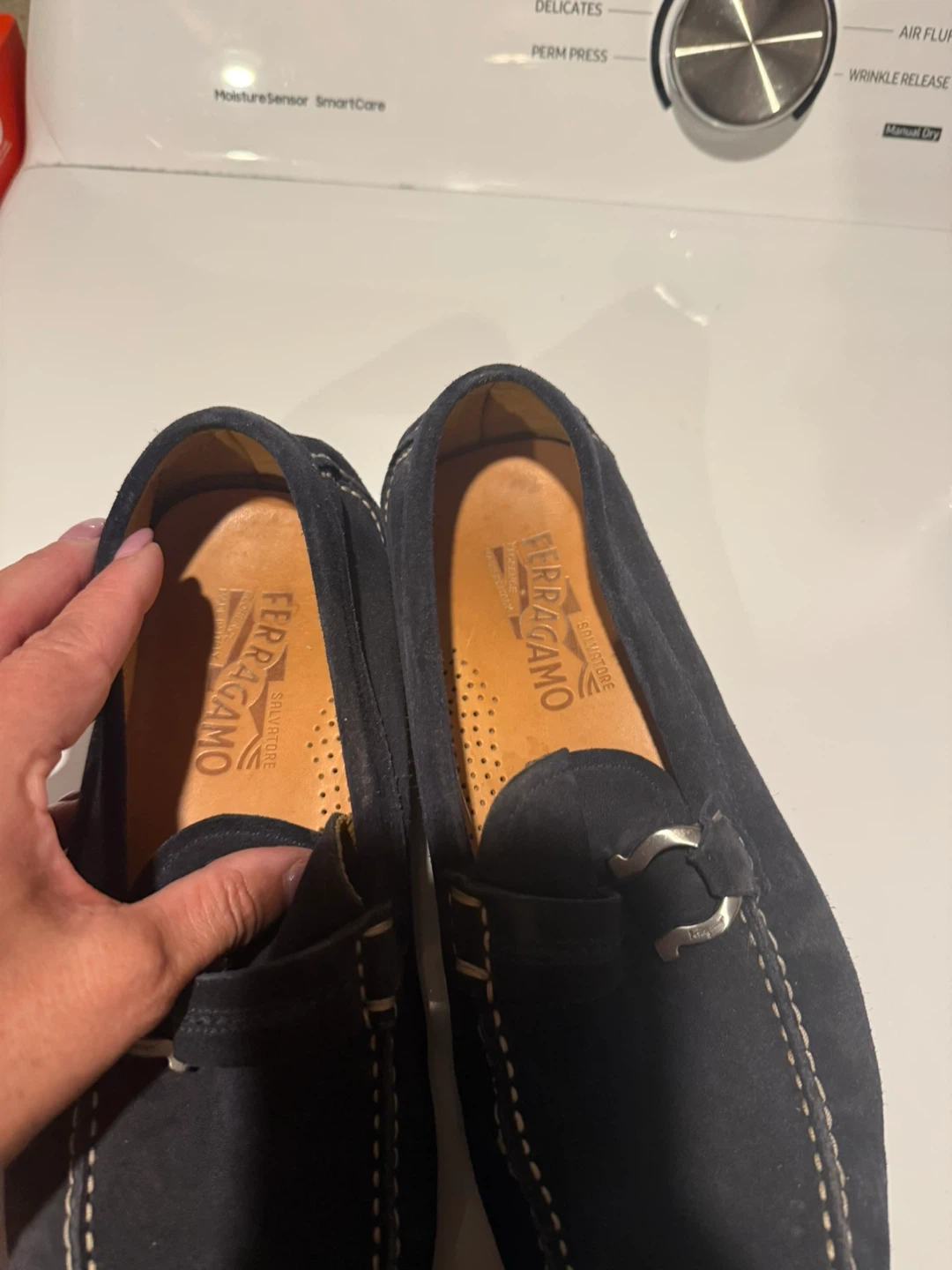 Selling a pair of Salvatore Ferragamo loafers in a dark blue suede. They are a men's size 9 EE. These stylish shoes are in good condition and ready for a new home!