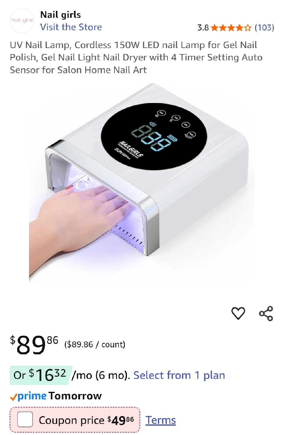 Selling a Nail Girls 150W LED nail lamp for gel nail polish. It's in like-new condition and comes with the original box and instructions! This nail lamp works great, the reflective bottom helps get even curing all over. It's nice and spacious inside so you can get a good cure on a full hand of long nails without bumping them on the inside. Selling because I have multiple for different uses but I'm moving and don't have the space.