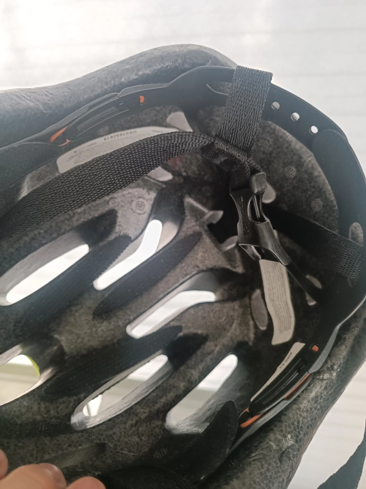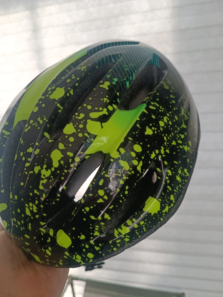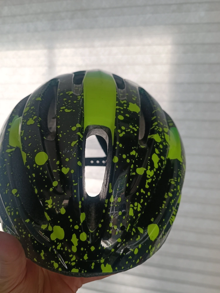 Selling a bike helmet in good condition. It's black with a cool green splatter design. Perfect for staying safe and stylish on your rides!