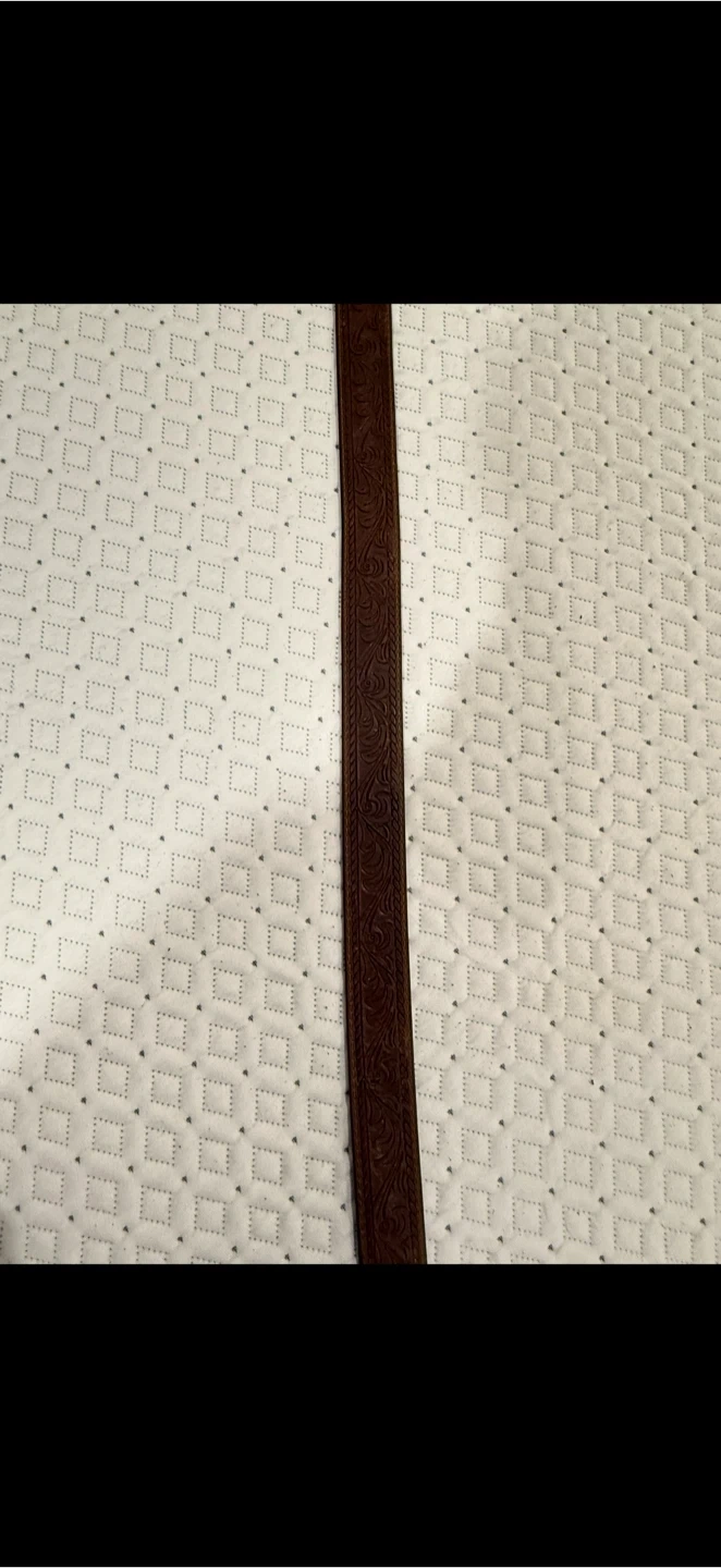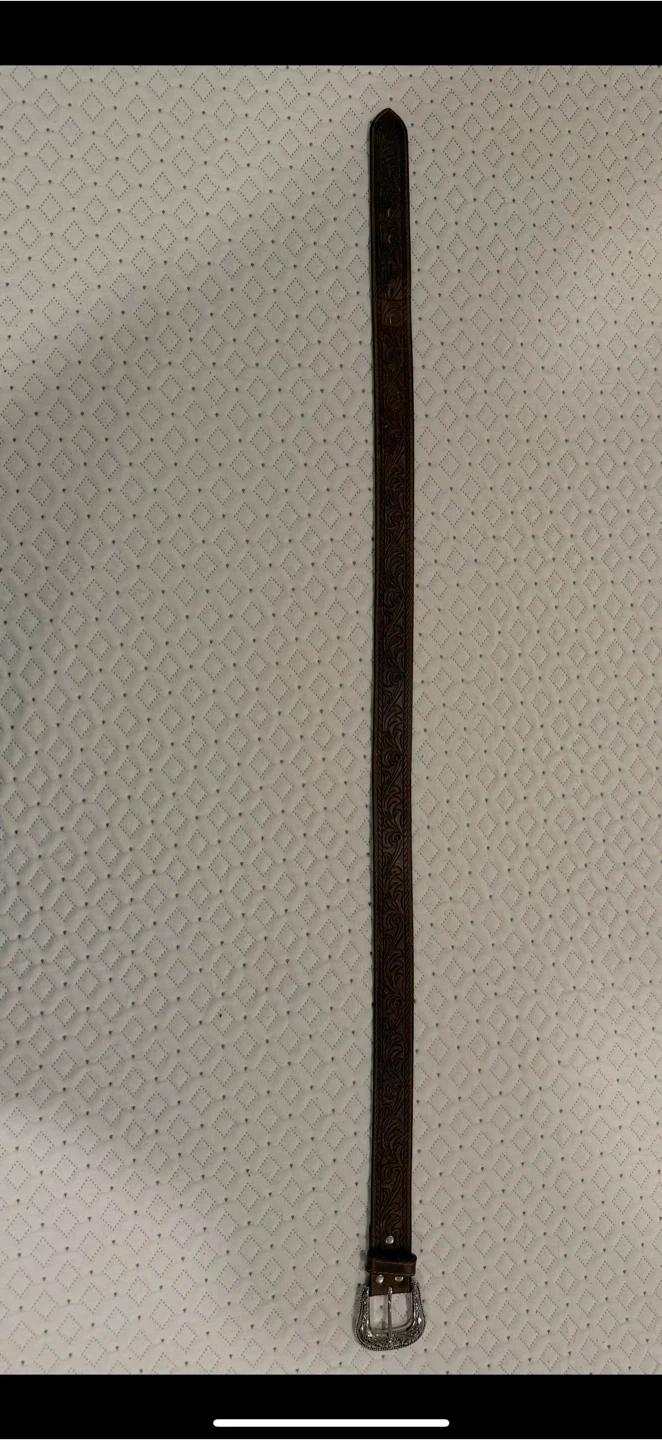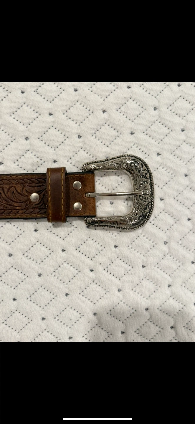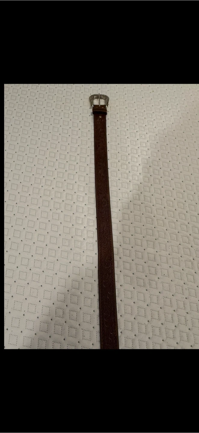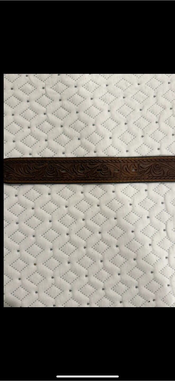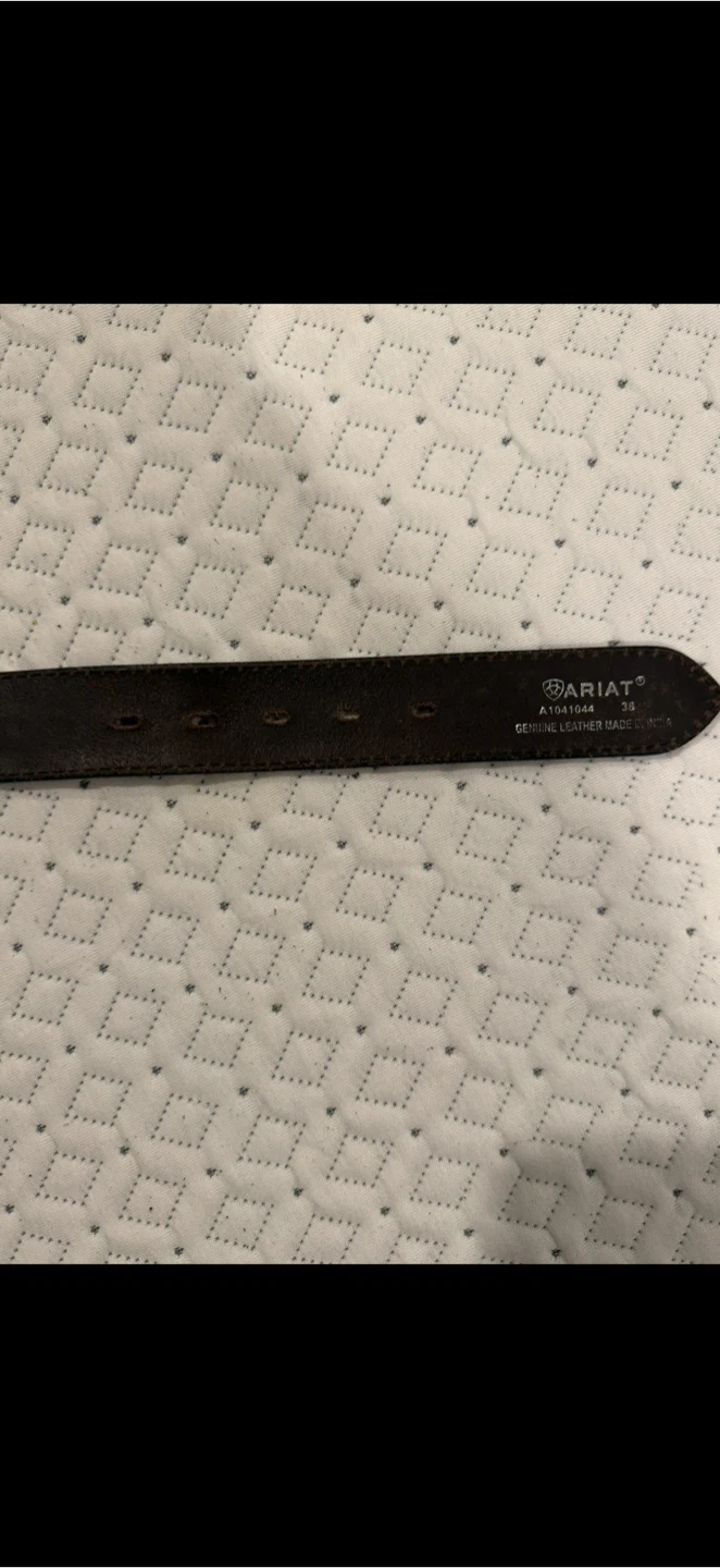 Here's a leather belt by Ariat! It is a size 38 and has a decorative pattern etched into the leather. Great for adding a bit of style to any outfit! Purchased wrong size and too much hassle to return to USA Niagara Falls Pick up only Cash only Willing to hold Willing to bundle OBO