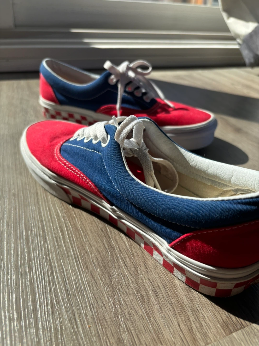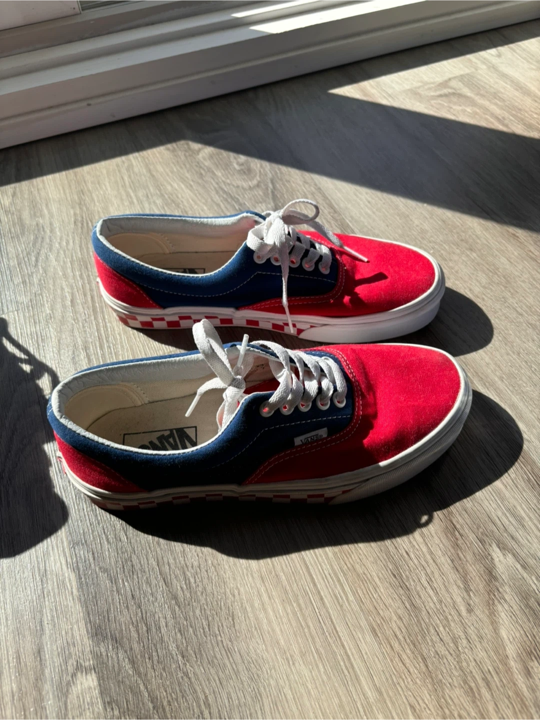Selling a pair of Vans Era sneakers in red and blue! These are in great shape and ready for a new home. The classic Vans style is perfect for everyday wear. Size: US Women 8.5, US Men 7.0, Eur 39.0
