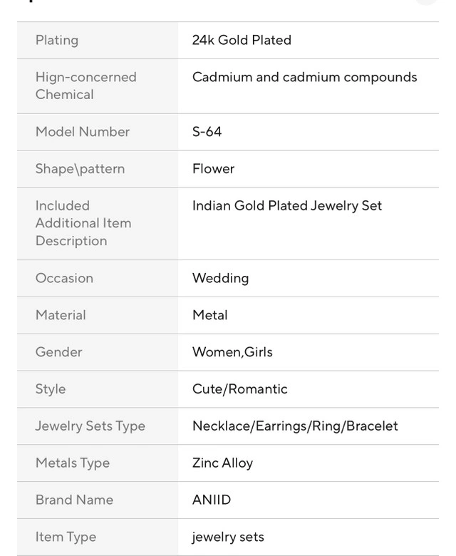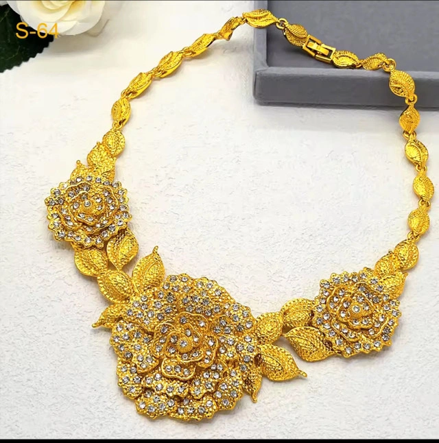 This ANIID jewelry set includes a necklace, earrings, ring, and bracelet, all plated in 24k gold and adorned with flower-shaped accents. This never used jewellery set is made from a zinc alloy and is designed in a cute and romantic style, perfect for weddings or special occasions. Key Features: * Plating: 24k Gold Plated * Material: Metal * Metals Type: Zinc Alloy * Style: Cute/Romantic * Shape/Pattern: Flower Looking for a touch of elegance? If the ad is up, it's available, ready to add some sparkle to your life!