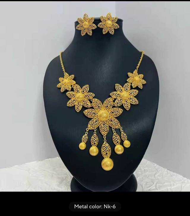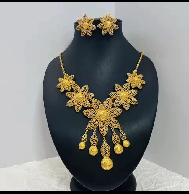 Elevate your style with this exquisite gold-toned floral necklace and earrings set, perfect for adding a touch of elegance to any occasion. This set is in New condition, offering a luxurious look without the brand-new price tag. Key features include: * Intricate floral design * Gold-toned finish * Matching earrings included * Necklace perimeter: 43cm / 17 inches * Earring Diameter: 2.6cm / 1 inch * Total weight: 72g Looking for a little sparkle to brighten your day? This set could be just the ticket. Don't miss out—if you see this ad, the necklace set is still available!