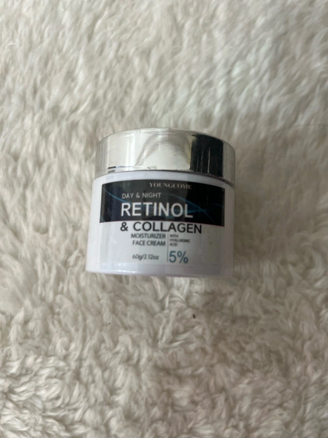 This is a 5% Youngcome Retinol & Collagen face cream, perfect for both day and night use, and comes in a 60g/2.12oz container. The cream is used, but in good condition, ready to rejuvenate your skin! Treat your skin, because why not? If the ad is up, it's available!