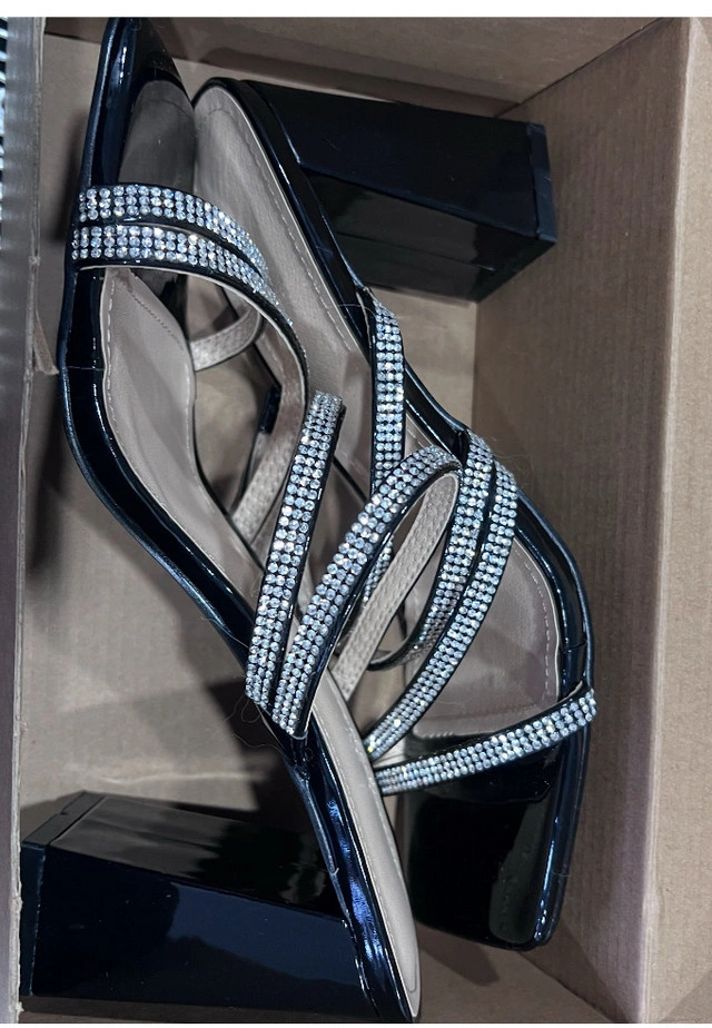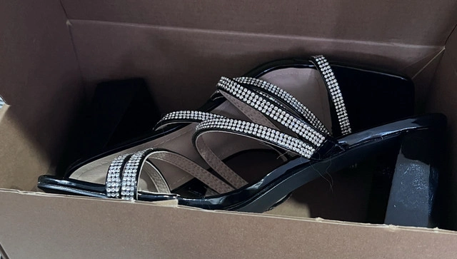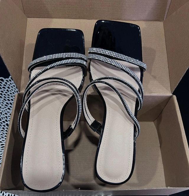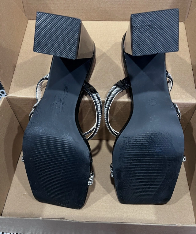 Step out in style with these barely worn black heeled sandals, featuring a chic square toe and dazzling rhinestone straps, perfect for adding a touch of glam to any outfit. The block heel provides stability and comfort, making them ideal for a night out or a special occasion. Key Features: * Colour: Black * Heel Type: Block heel * Embellishments: Rhinestone straps * Toe Shape: Square toe * Condition: New Looking for a touch of sparkle? These sandals are your answer! Don't miss out on adding these beauties to your wardrobe. If the ad is up, they're still available!