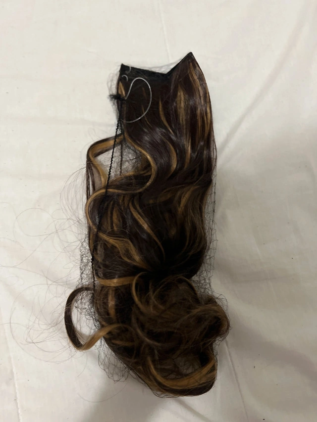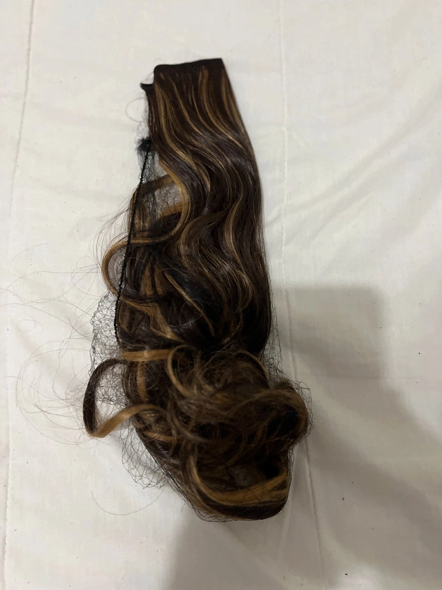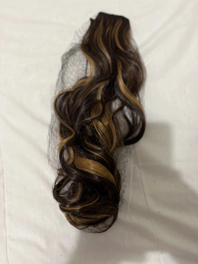 Add some flair to your look with this brown and blonde curly hair extension! This piece has lots of life left for adding volume and style to your hair.