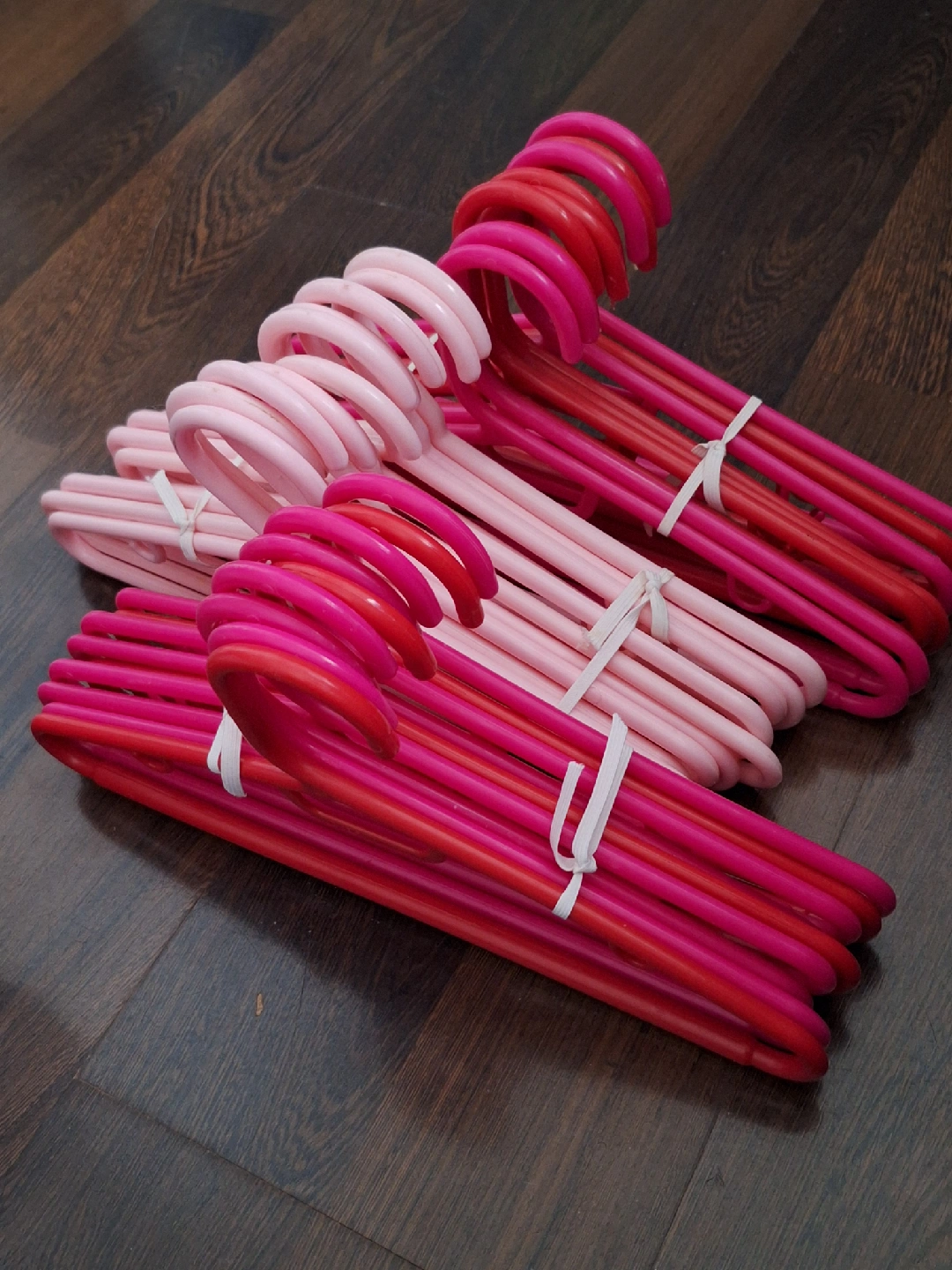 Selling a lot of 28 kids clothes hangers in varying shades of pink and red. These are great for organizing your closet and adding a pop of colour! They're in excellent condition and ready for a new home