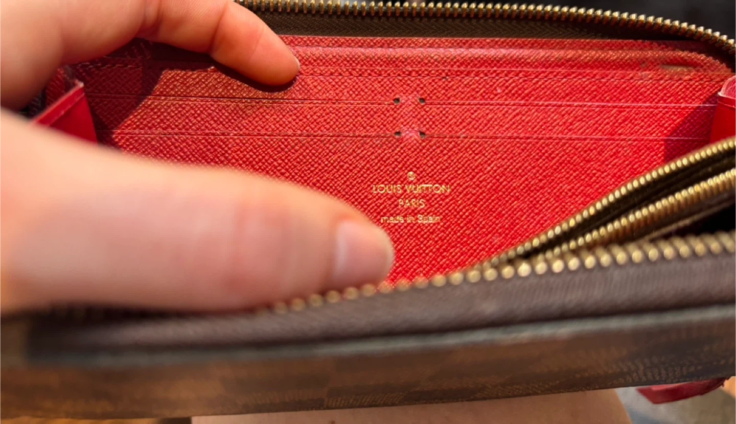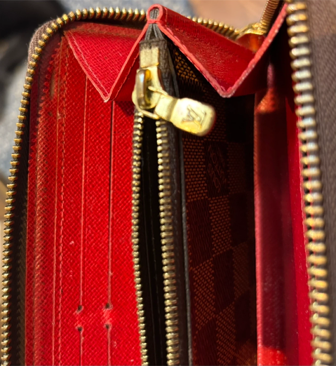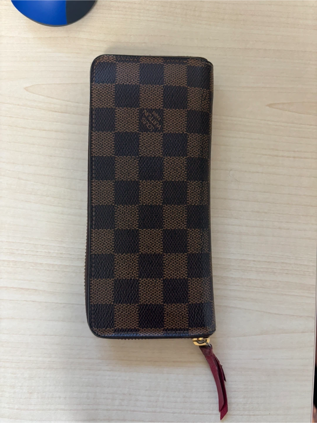 Selling a Louis Vuitton Damier Ebene Clemence Wallet. It has a brown checkered exterior and a vibrant red interior. Exterior like new. Some minor wear on zip and interior corner (see photo)