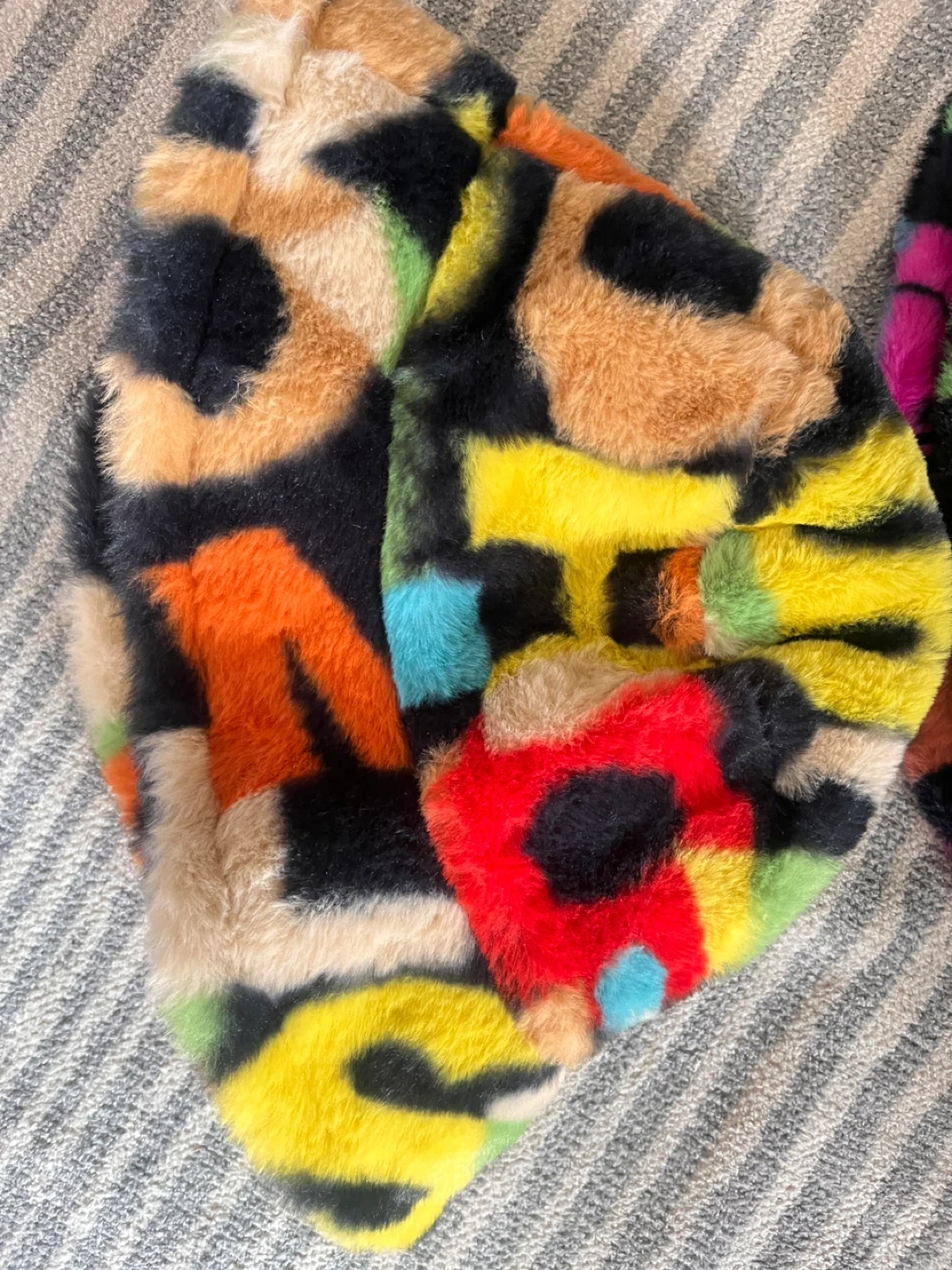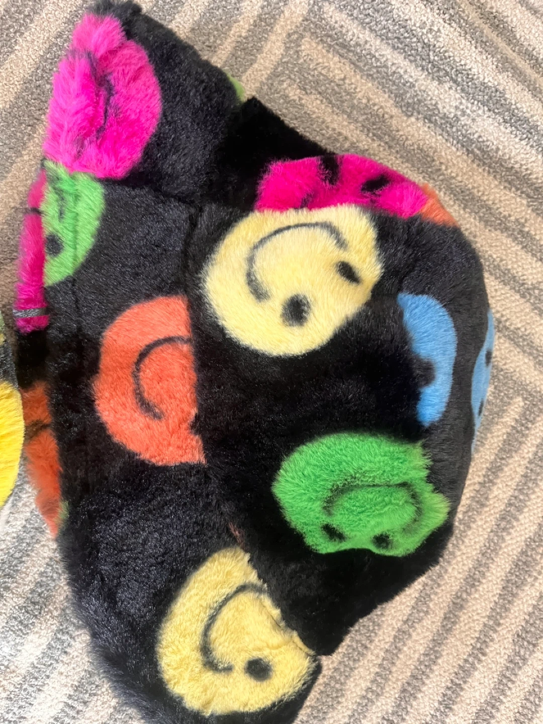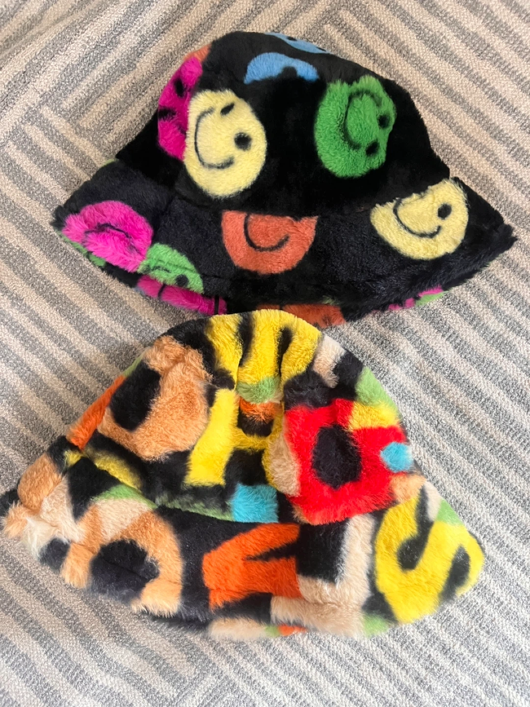Selling these super fun and funky fuzzy bucket hats! They're perfect for adding a pop of colour and personality to any outfit. One has a colourful smiley face design and the other is a mix of bright geometric shapes. They're both in great condition and ready for a new home!