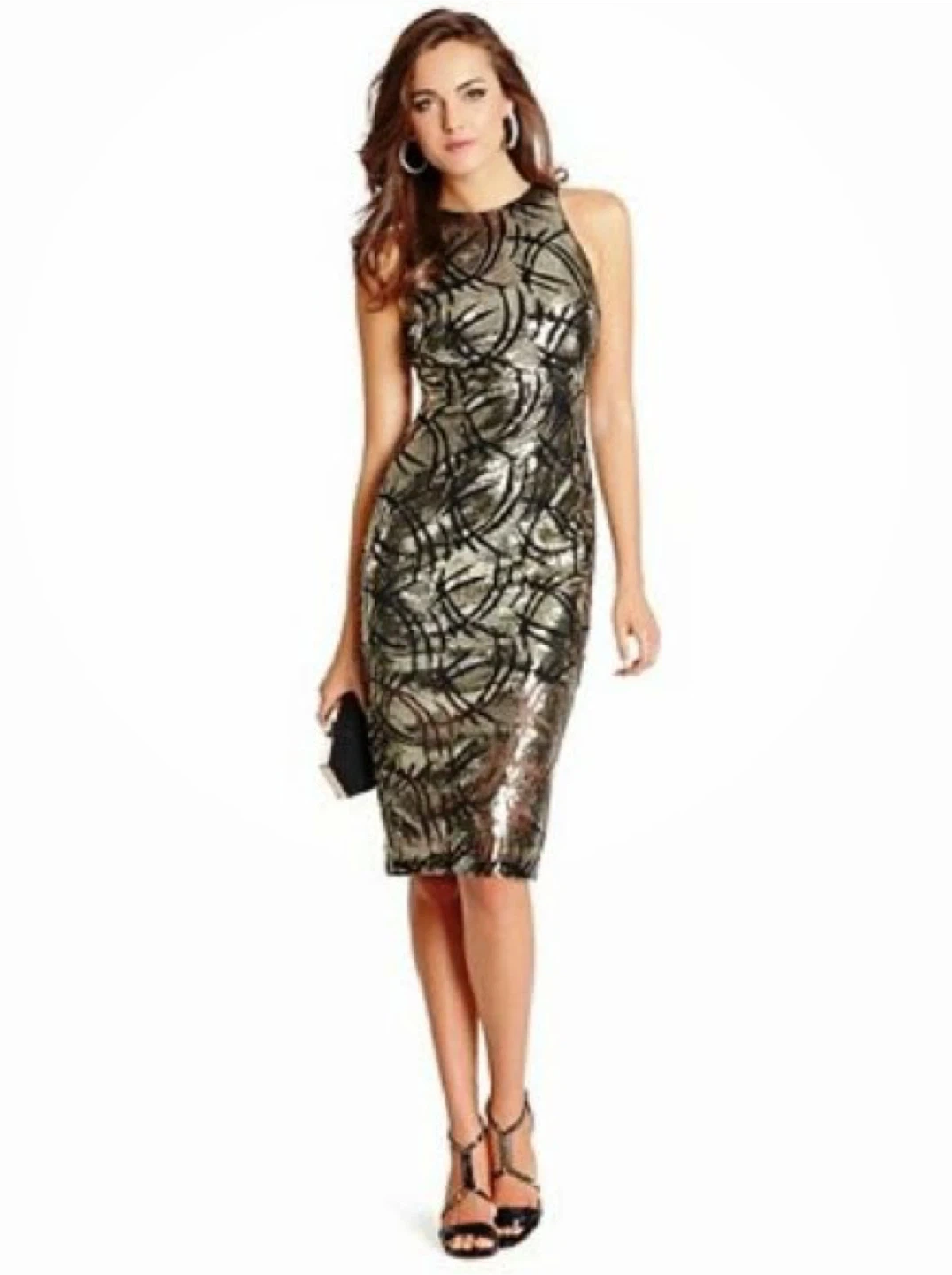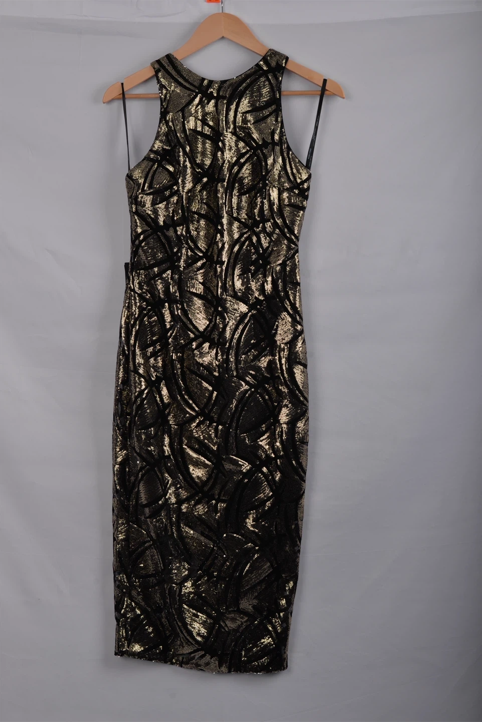 This Guess by Marciano dress features a stunning gold and black pattern! It's perfect for a night out or a special occasion. Never worn, tag still on. Price from store was ~$400.