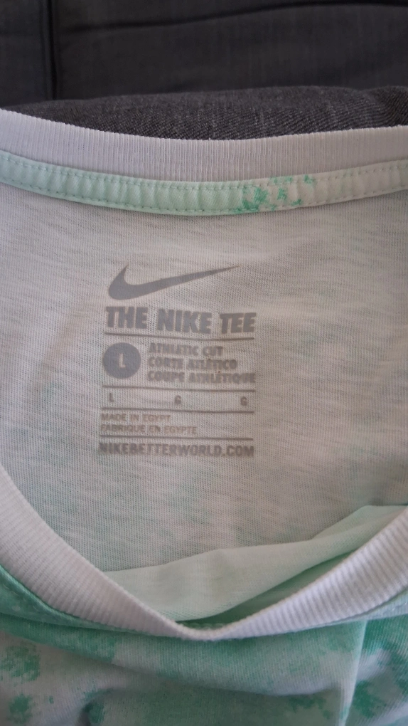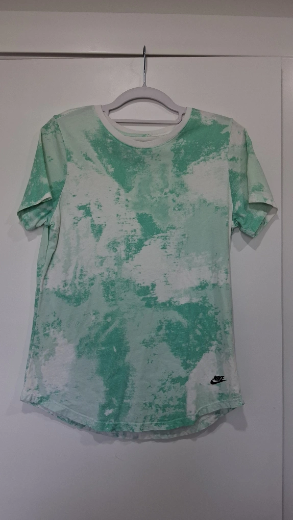 Nike Athletic Cut Tee in size L. The shirt is a light green and white tie-dye pattern. It is in good condition and ready for a new home