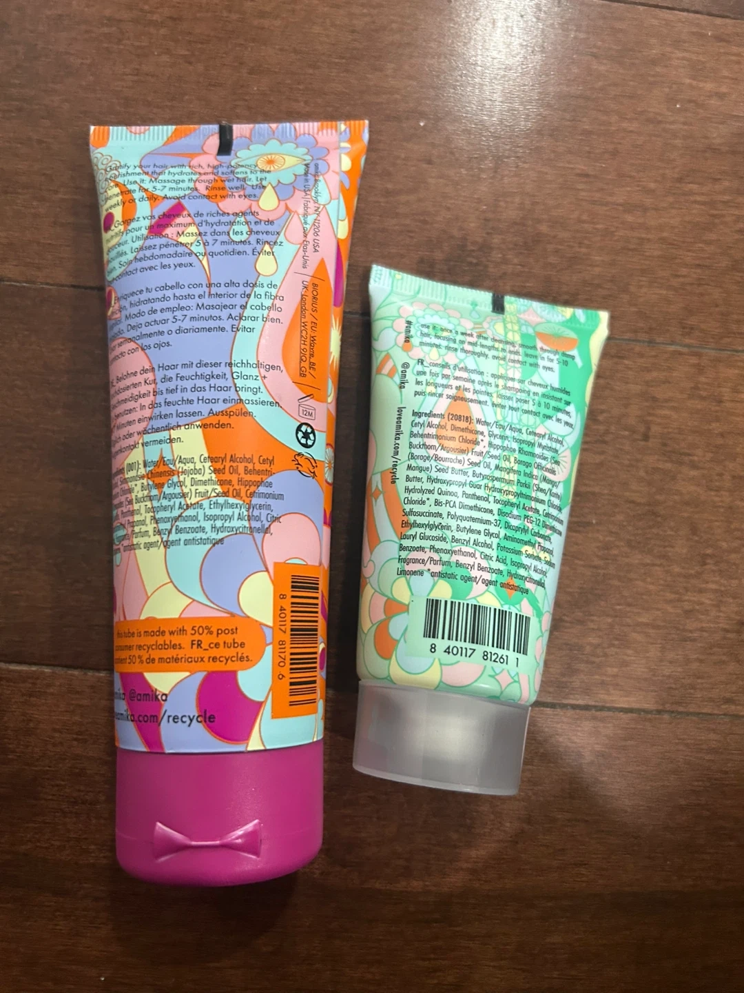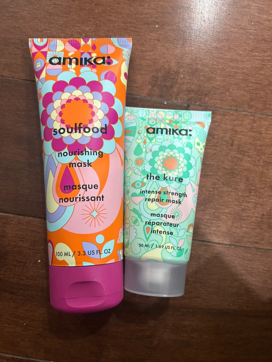 Selling two Amika hair masks! One is the Soulfood nourishing mask (100 ml / 3.3 US fl. oz.) and the other is The Kure intense strength repair mask (50 ml / 1.69 US fl. oz.)