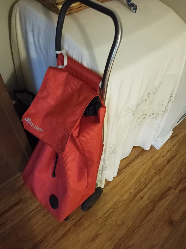 This is a Rolser shopping trolley in red. It is in good condition and ready to help you with your groceries or other shopping needs.