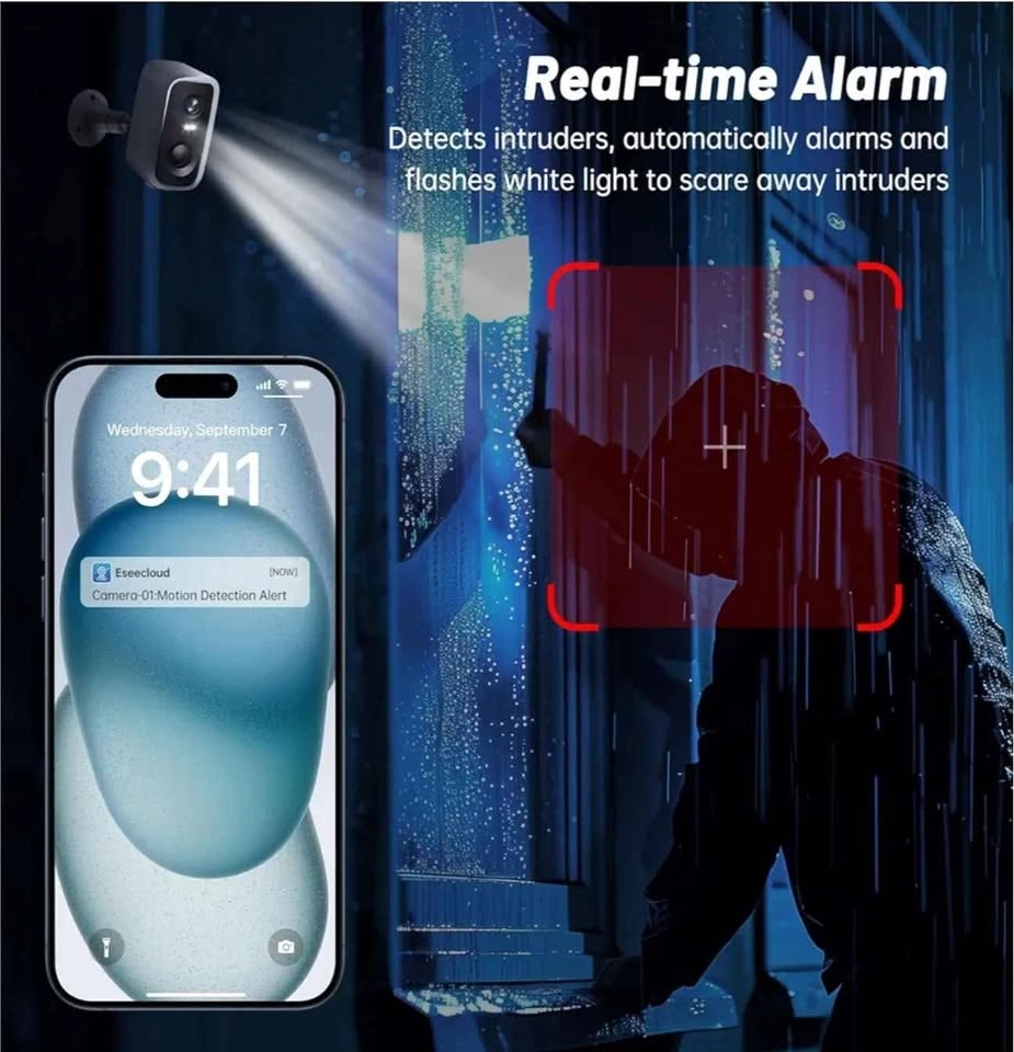 Amazon price is $40. Open box Chpuss Security Cameras Wireless Outdoor has built-in rechargeable batteries that can be charged through the USB cable. Works with 2.4GHz Wi-Fi. Not support 5GHz. The camera surveillance interieur provide a more comprehensive range of viewing angles and clearer picture quality,the outdoor & indoor security cameras has two options for night vision: full-color mode and infrared mode with a 33ft visible range.The built-in LED floodlight makes this security camera's colorful night vision add a splash of color to every night. Wireless security camera outdoor for home security use advanced artificial intelligence algorithms to achieve humanoid recognition. You will receive an alarm notification when a Human was Detected,the notification comes with a picture preview which helps you quickly respond to it. The indoor & outdoor surveillance cameras baby monitor/pet camera / dog camera with phone app has a built-in microphone and speaker ,supporting real-time communication,Video Playback and multi-window viewing. This WiFi security cameras wireless can be shared with multiple users. The home security camera outdoor is protected by IP66 weatherproof technology. The surveillance cameras can automatically save video to a TF card (up to 128G, not included) or cloud storage. One Eseecloud app can add a lot of security cameras at the same time.Supports 2.4Ghz WiFi only.