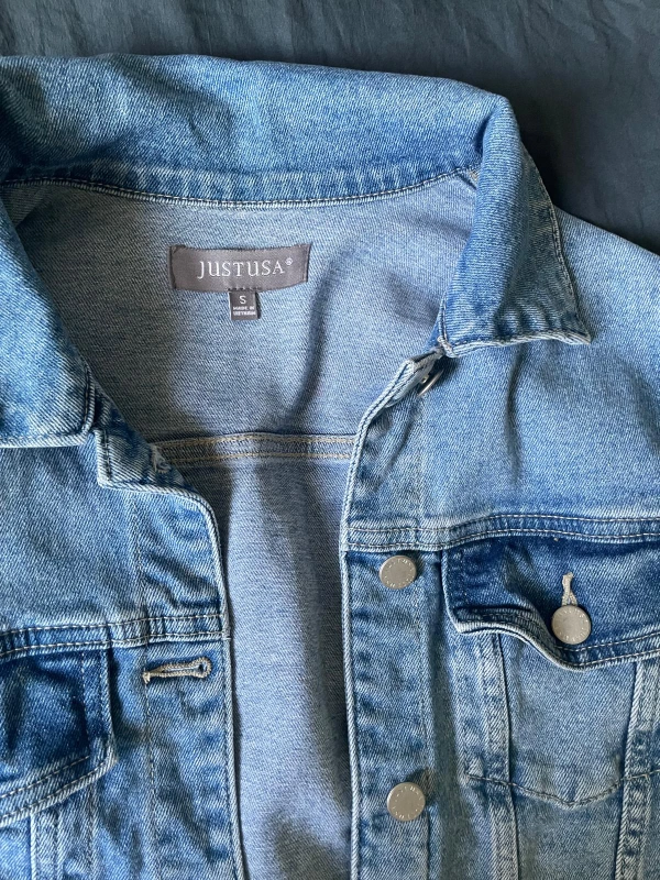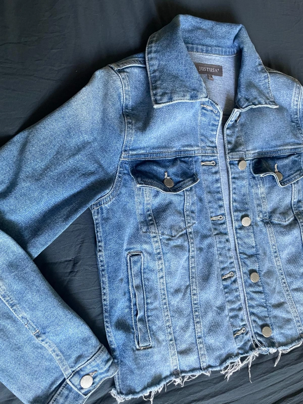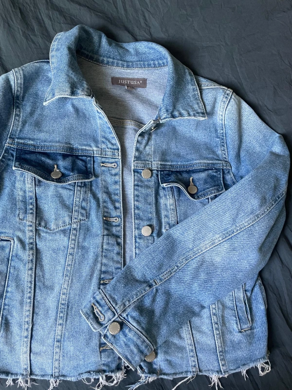 Selling a JUST USA denim jacket in size small! It's a classic light wash denim with silver buttons. Perfect for layering or wearing on its own. In great condition! It has pockets on both sides.