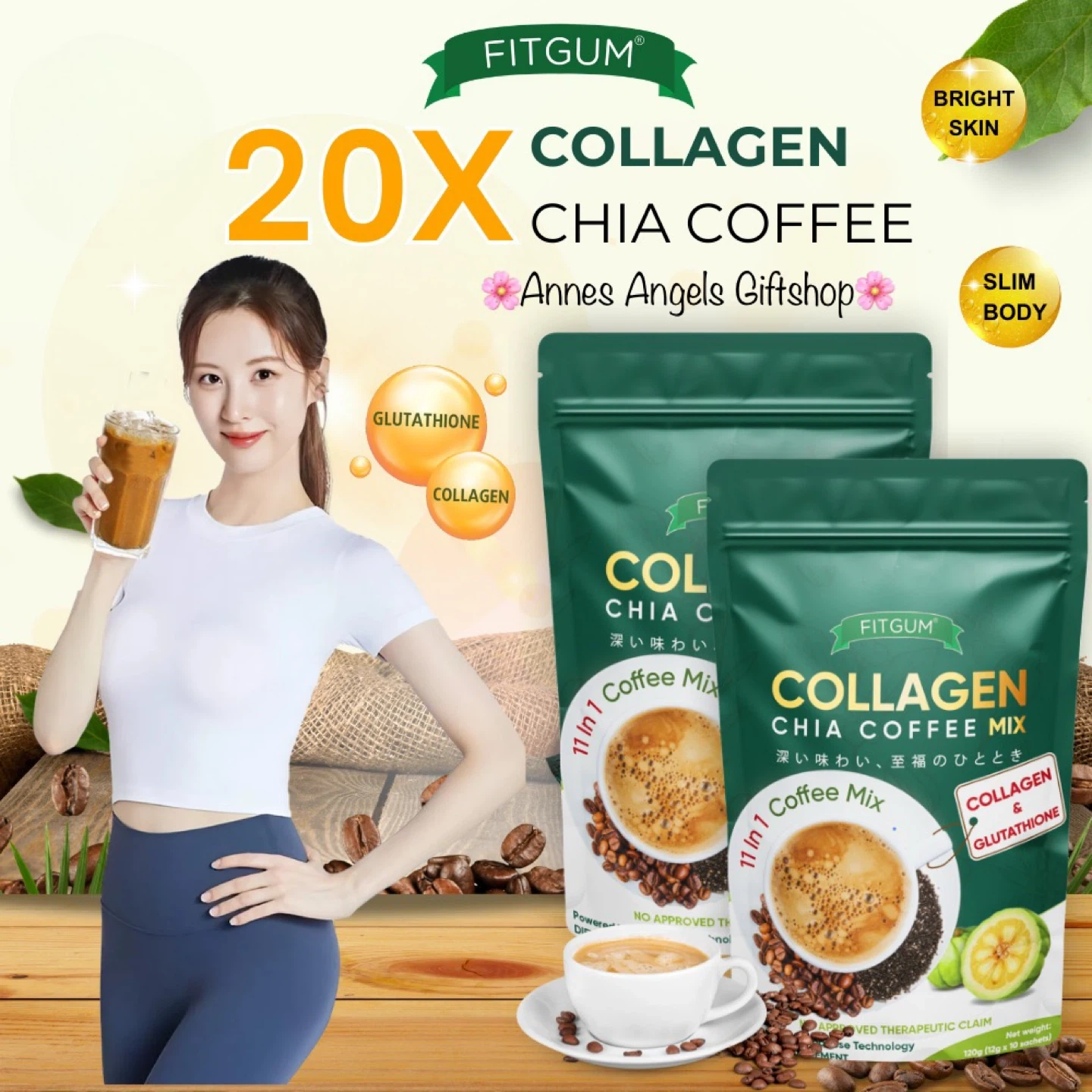 Get your daily dose of collagen with Fitgum Collagen Chia Coffee Mix! This coffee mix contains collagen and glutathione for bright skin and a slim body. It's a delicious and convenient way to support your wellness goals