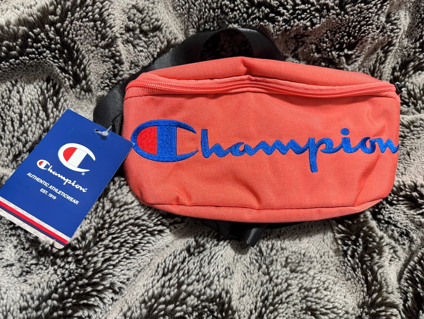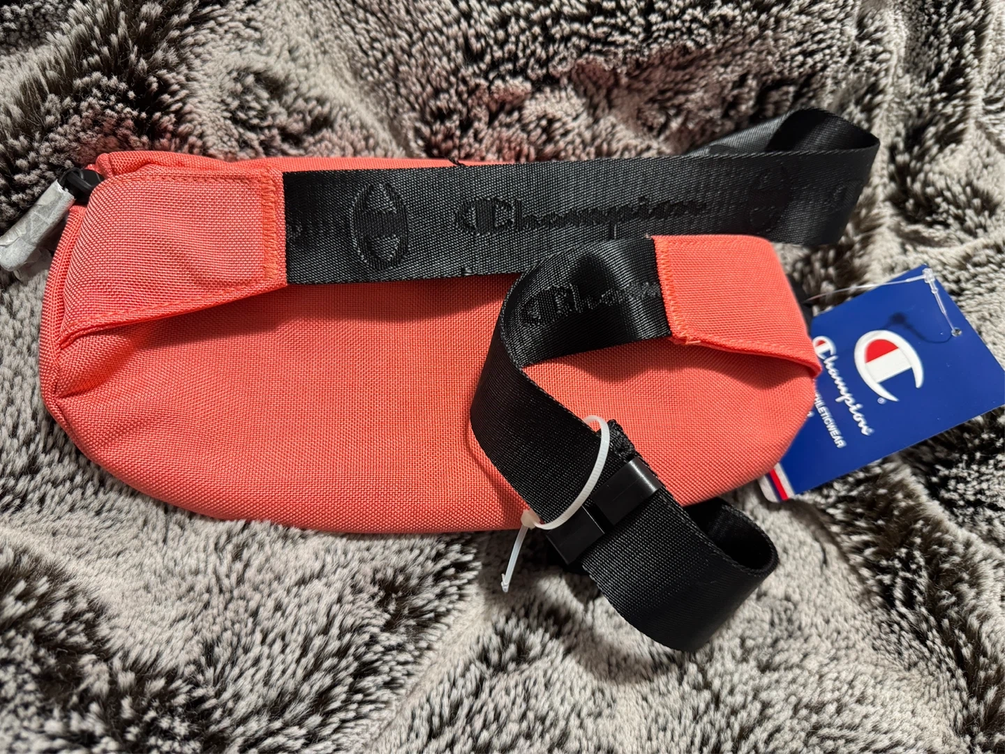 This Champion belt bag is brand new with tags! It's a salmon colour and features the Champion logo embroidered in blue. The strap is adjustable and black. Perfect for carrying your essentials hands-free! Price $20