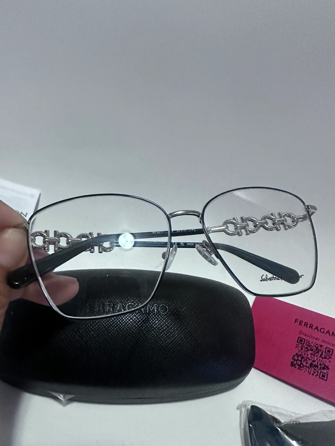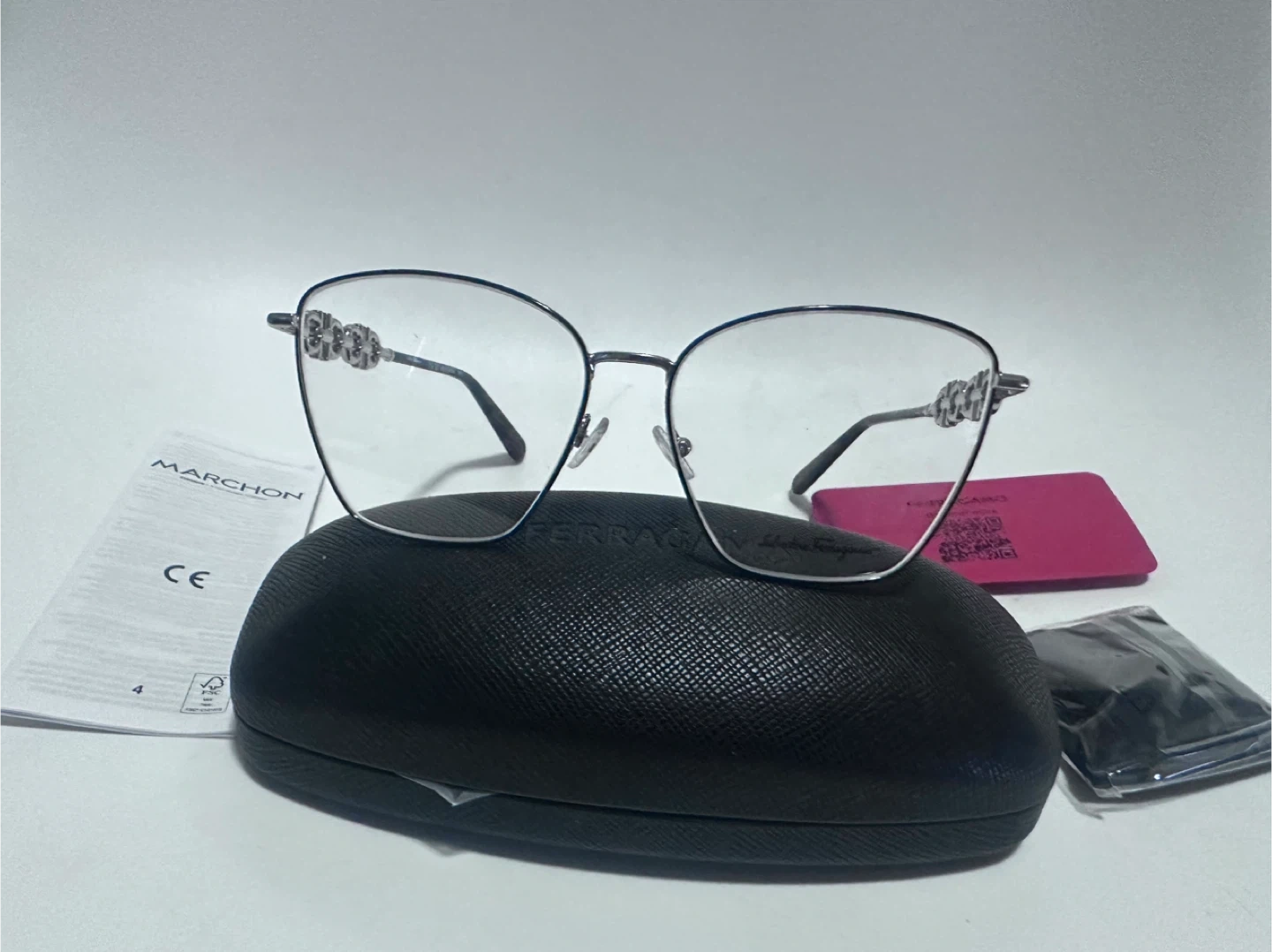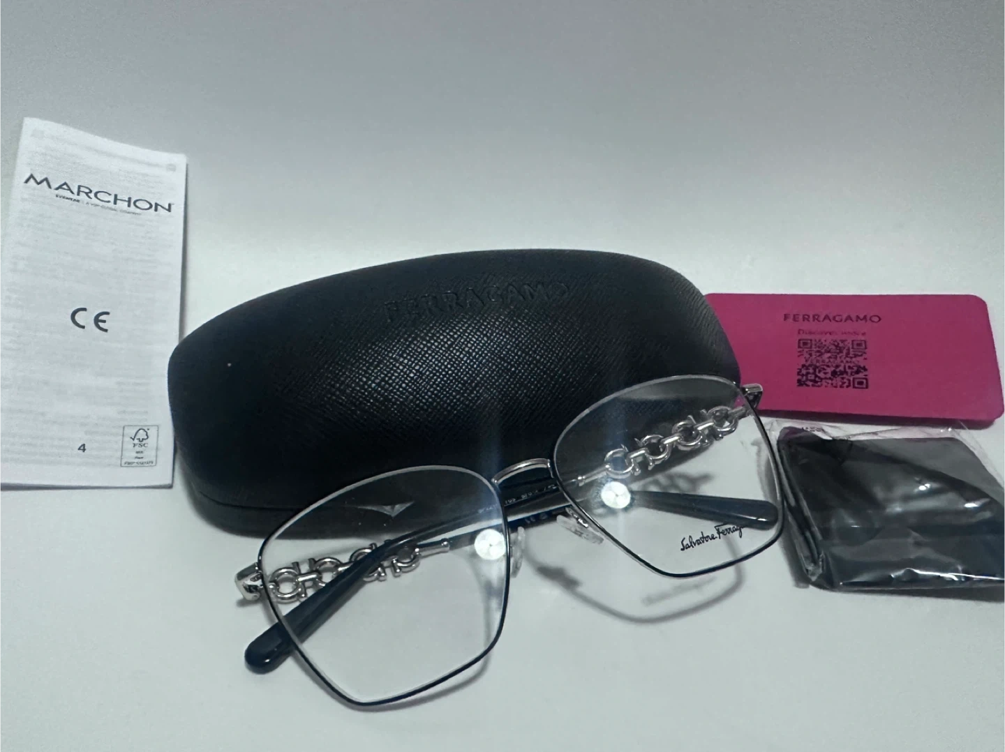 Selling a pair of Salvatore Ferragamo eyeglasses. They come with the case and a cleaning cloth. The glasses have a unique chain design on the sides. Great condition and ready for a new home