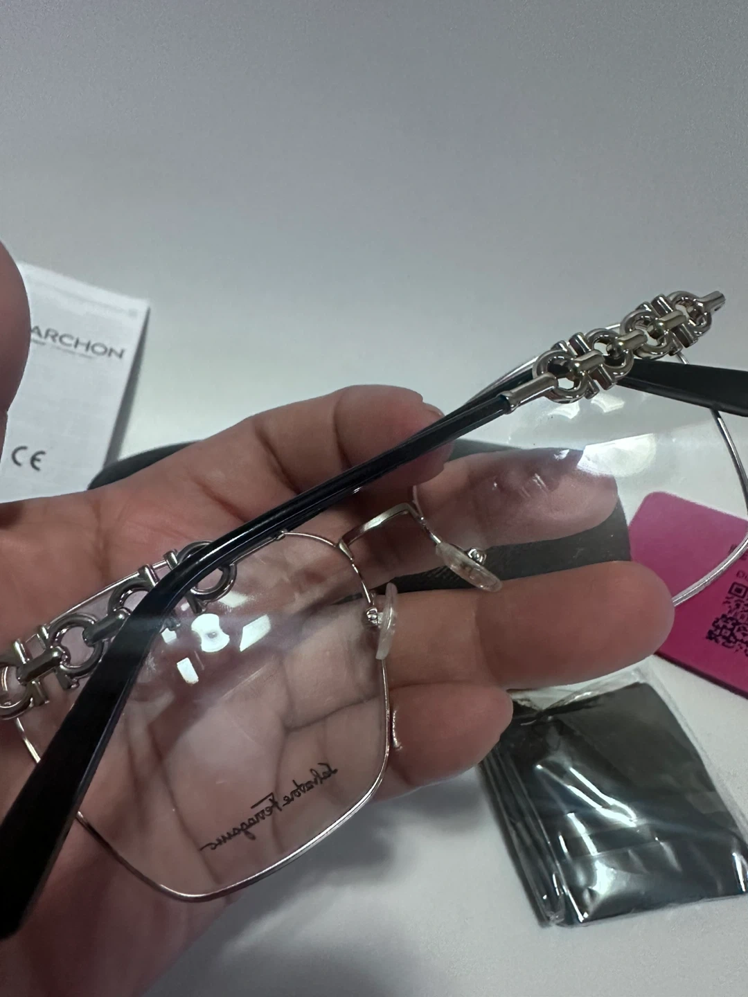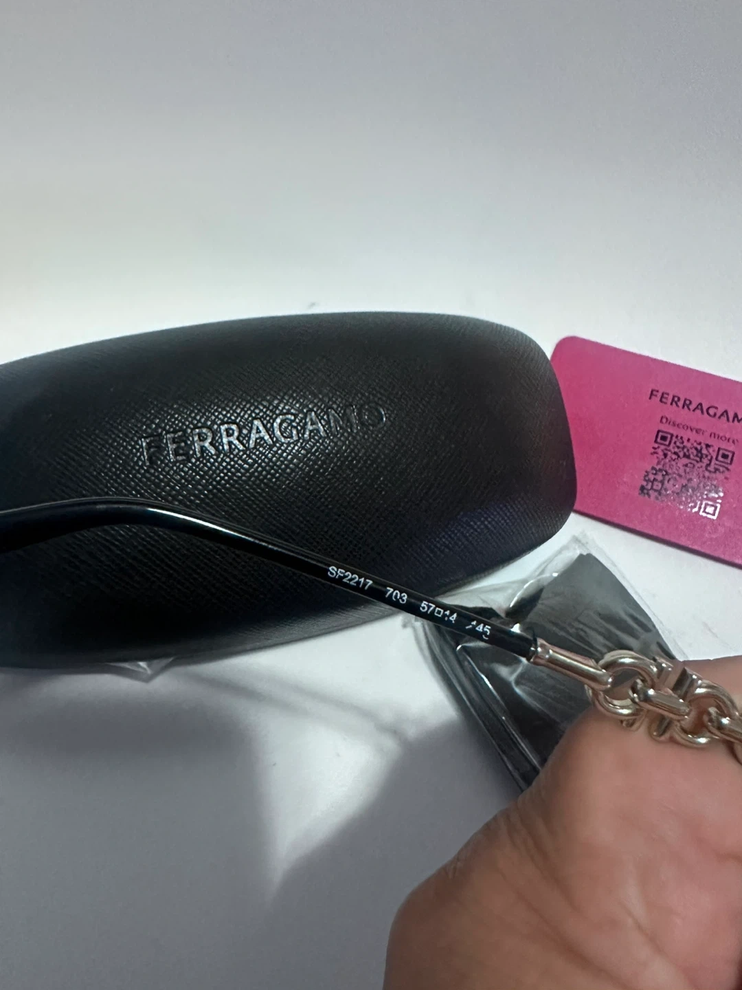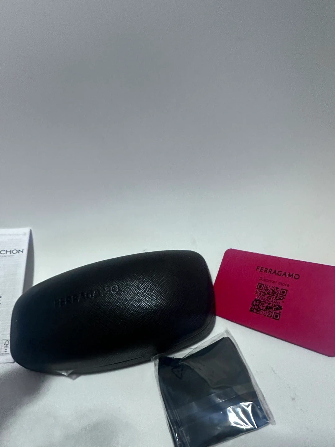 Selling a pair of Salvatore Ferragamo eyeglasses. They come with the case and a cleaning cloth. The glasses have a unique chain design on the sides. Great condition and ready for a new home