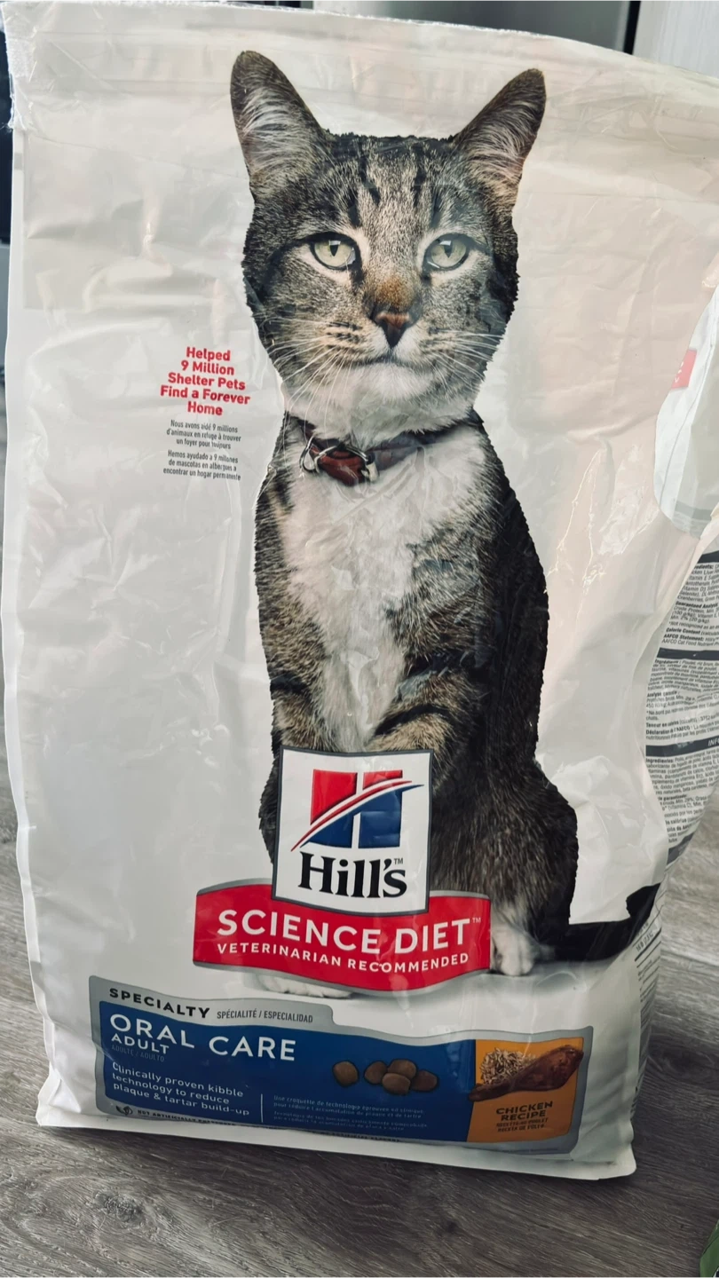 Giving away half a bag of Hill's Science Diet Oral Care adult cat food. My cats have grown out of this flavour. Still edible. Clinically proven kibble technology to reduce plaque and tartar build-up. The food is chicken recipe.