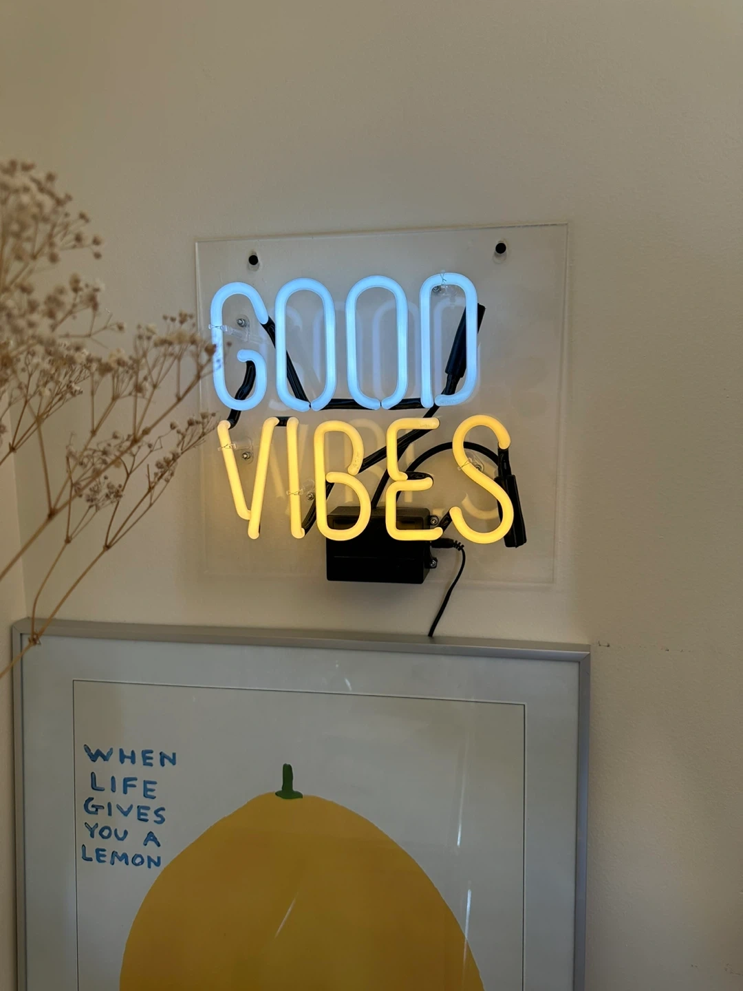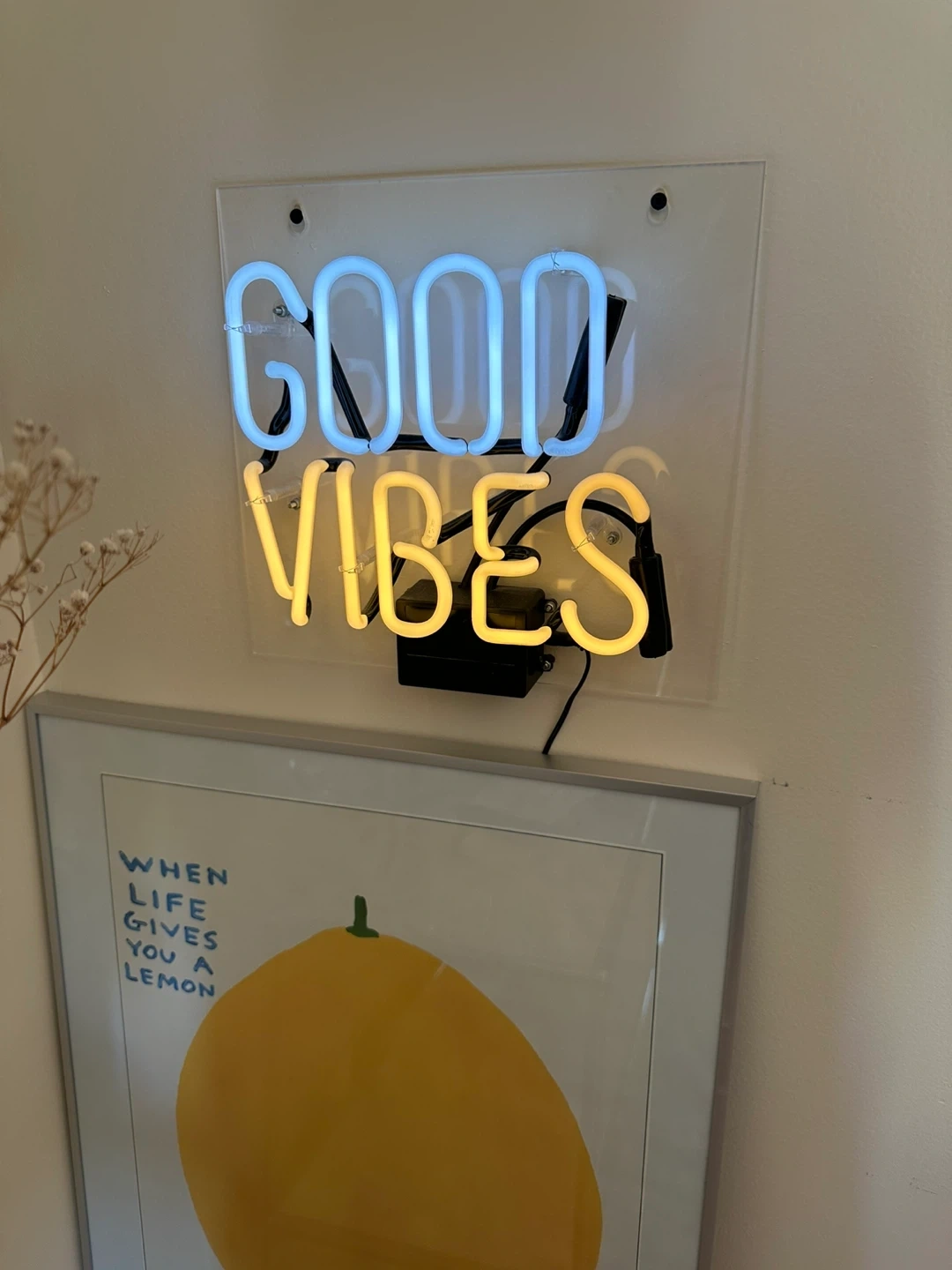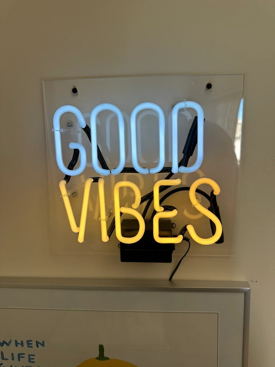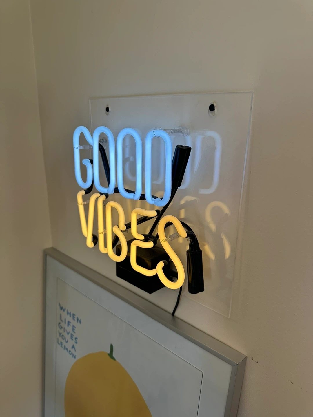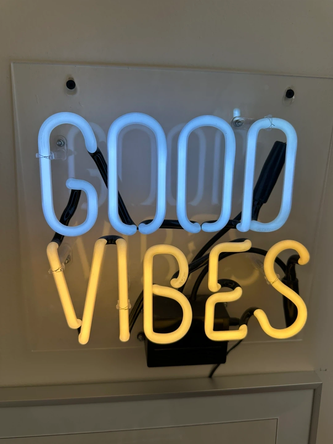 Selling a cute 'Good Vibes' neon sign! It's in great condition and ready to bring some positive energy to your space. The sign features a cool blue and warm yellow glow, perfect for adding a pop of colour to any room