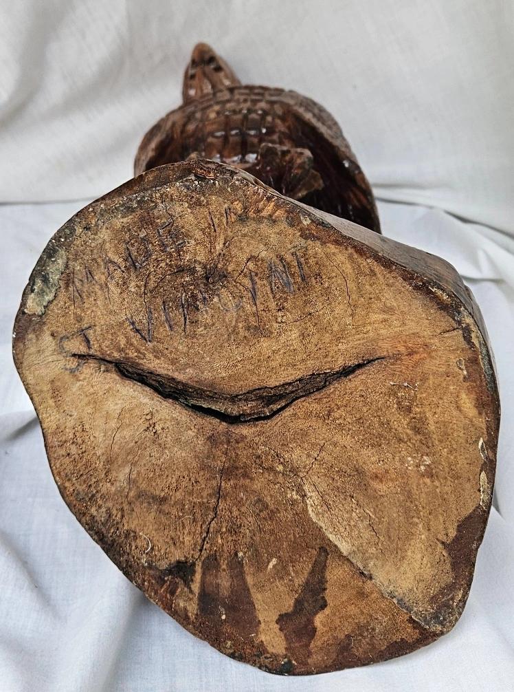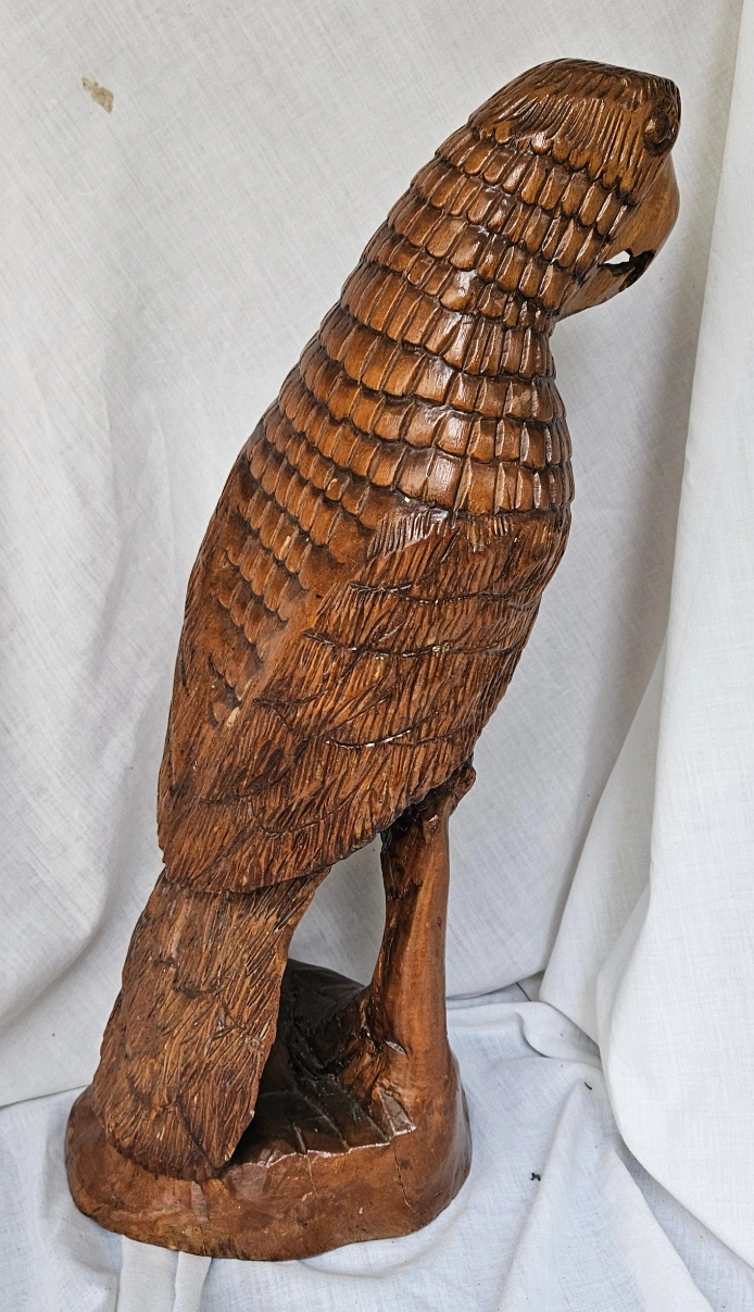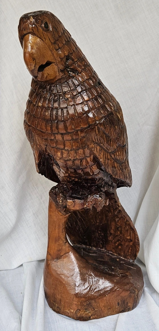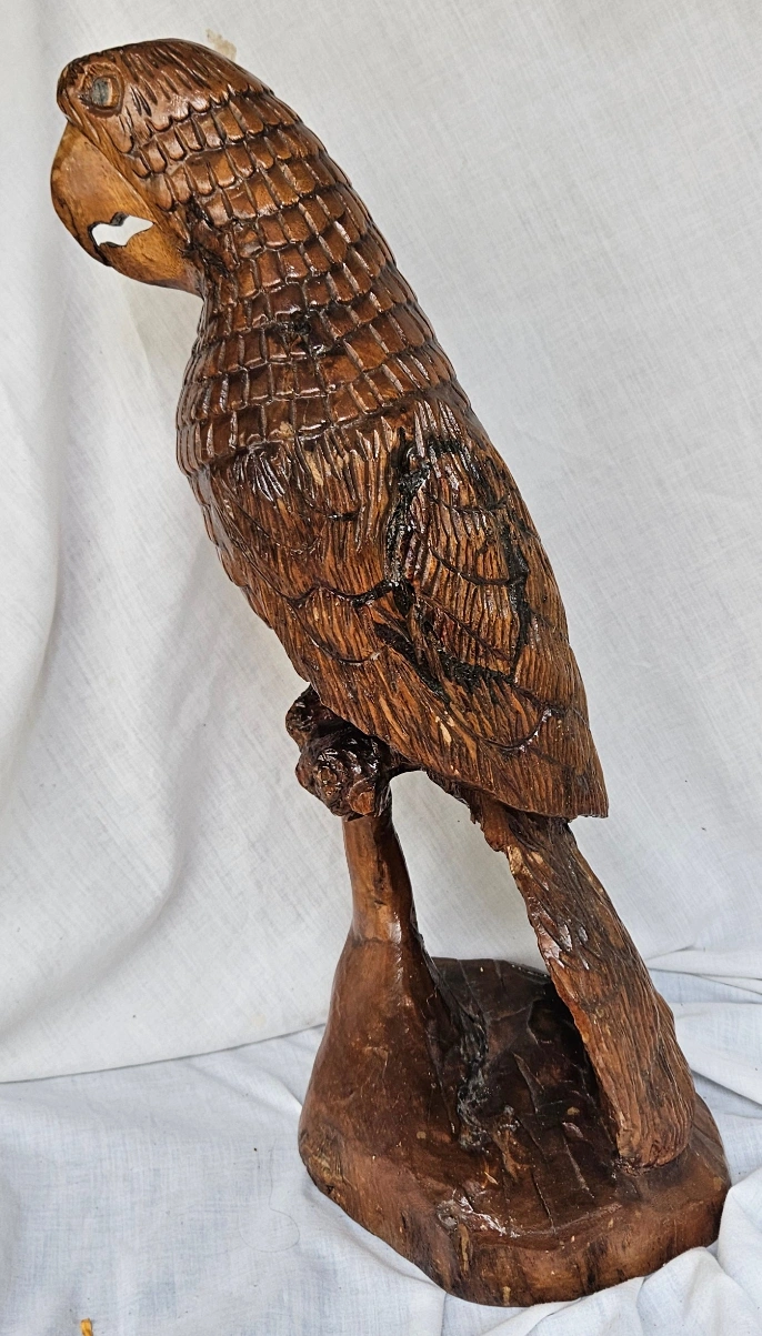 Vintage Hand Carved Wooden Parrot St. Vincent Circa 1960’s This vintage hand carved wooden parrot circa from the 1960’s, is in excellent cond. There are no cracks or missing pieces of any kind. This was hand carved from one piece, from St. Vincent Islands Breadfruit Tree. The measurements of this vintage hand carved wooden Parrot from the St. Vincent Islands are Height 20”x Width 6” x Depth 8” and weighs around 10lbs