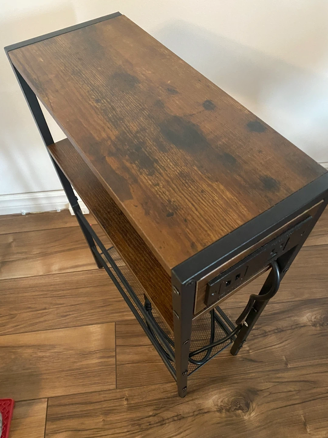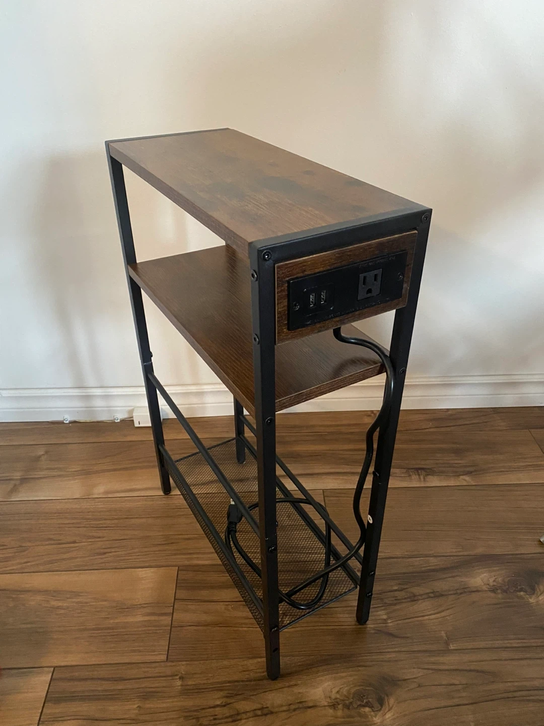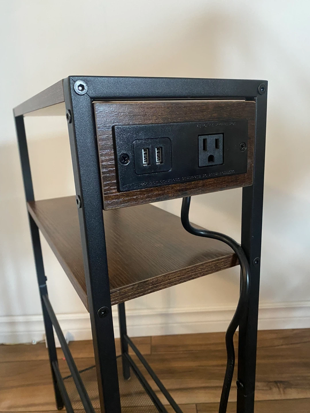 Selling a handy end table that is perfect for small spaces! It's brown with a black metal frame, and it has built-in USB ports and an outlet, super convenient for charging your devices. Excellent condition. Bought on Amazon for $42. Dimensions: 18 D 41.9 W 65 H