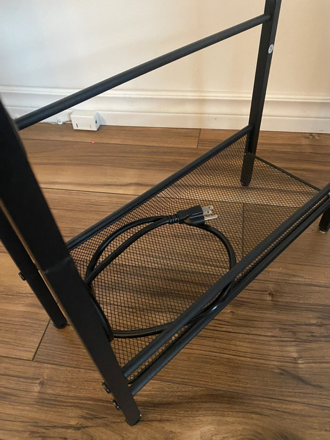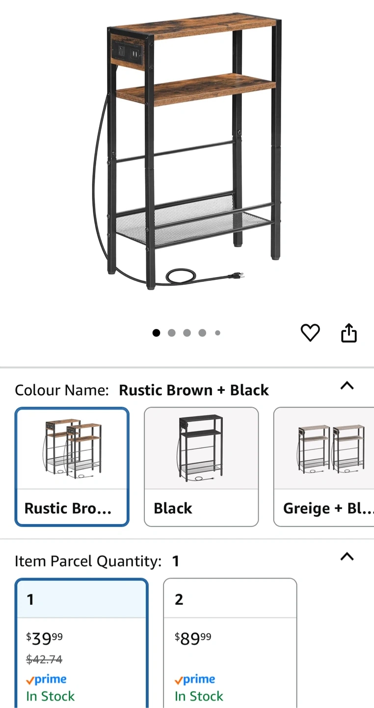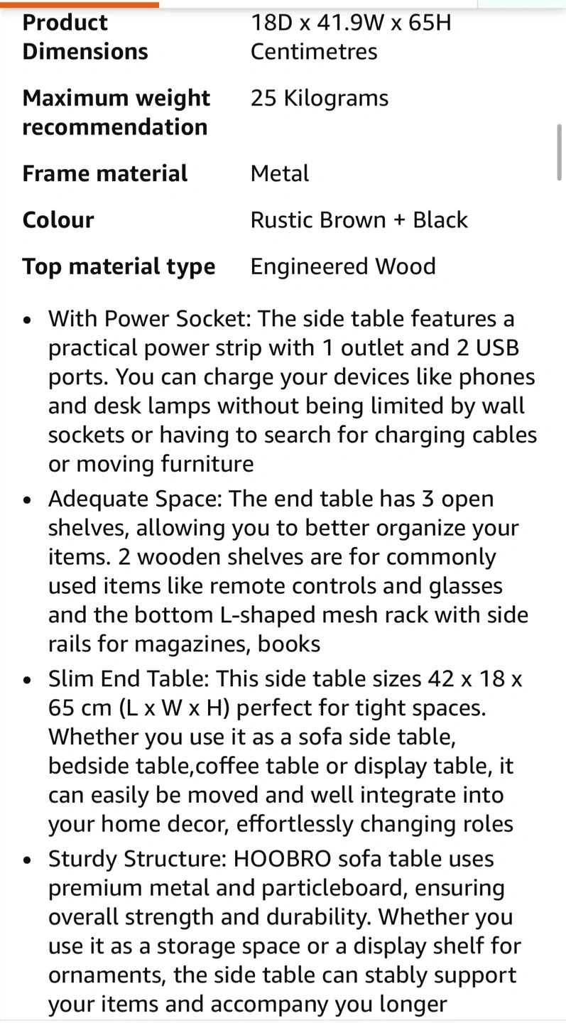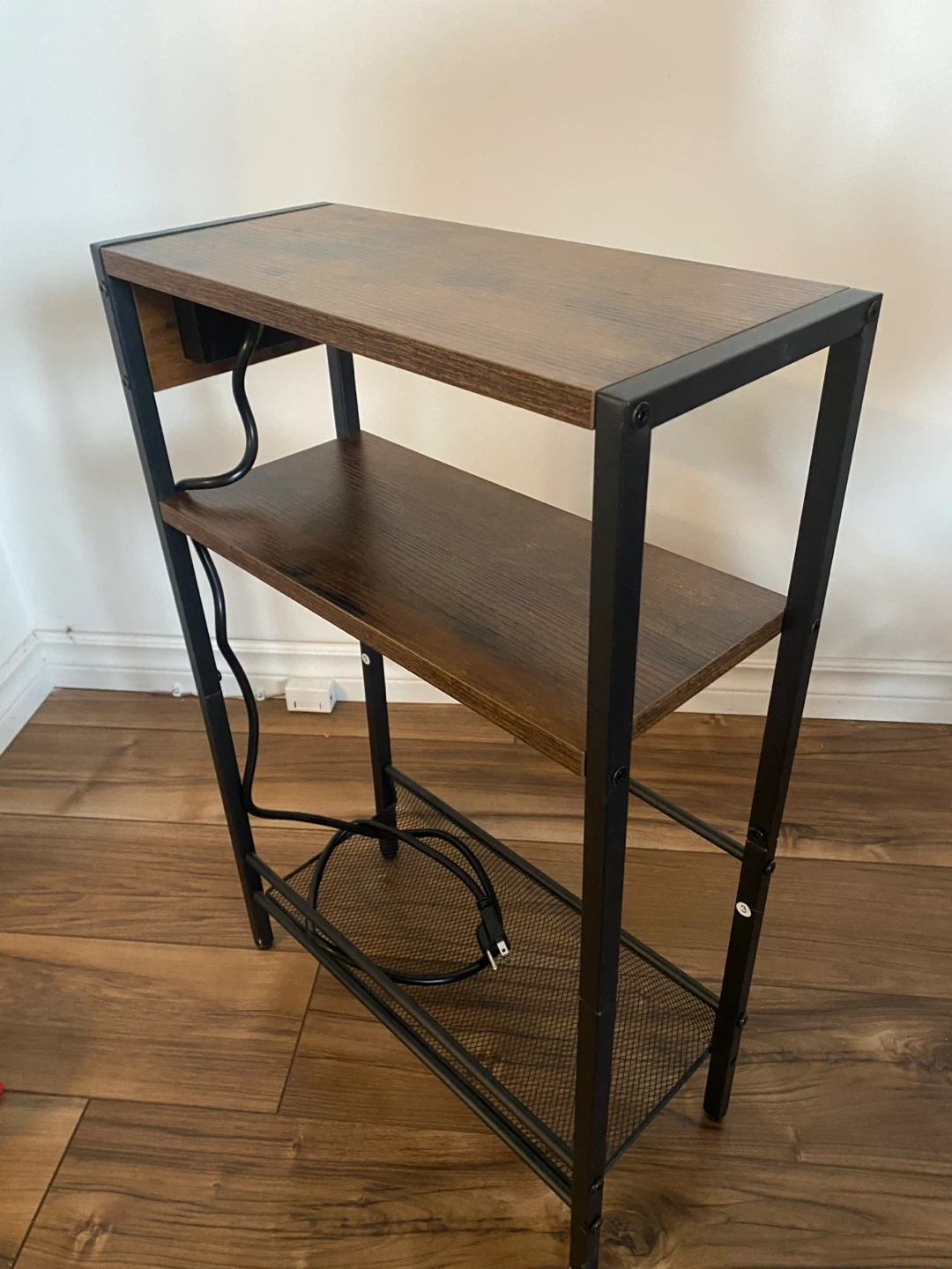 Selling a handy end table that is perfect for small spaces! It's brown with a black metal frame, and it has built-in USB ports and an outlet, super convenient for charging your devices. Excellent condition. Bought on Amazon for $42. Dimensions: 18 D 41.9 W 65 H