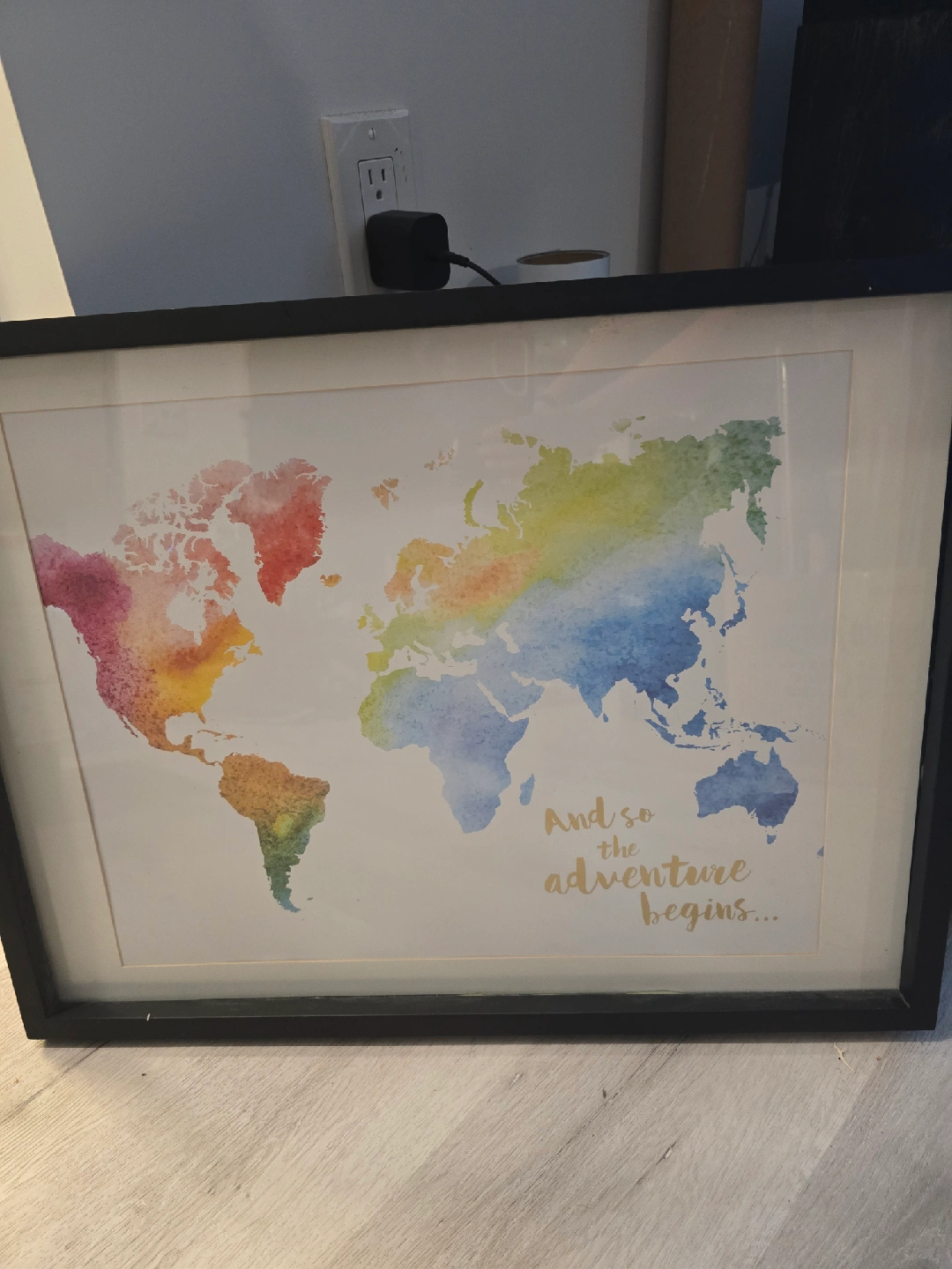 Selling a framed watercolour world map art piece. It says 'And so the adventure begins' in gold lettering. Perfect for adding a touch of wanderlust to any room! love it just havent gotten around to hanging it up for like a year so its gotta go!