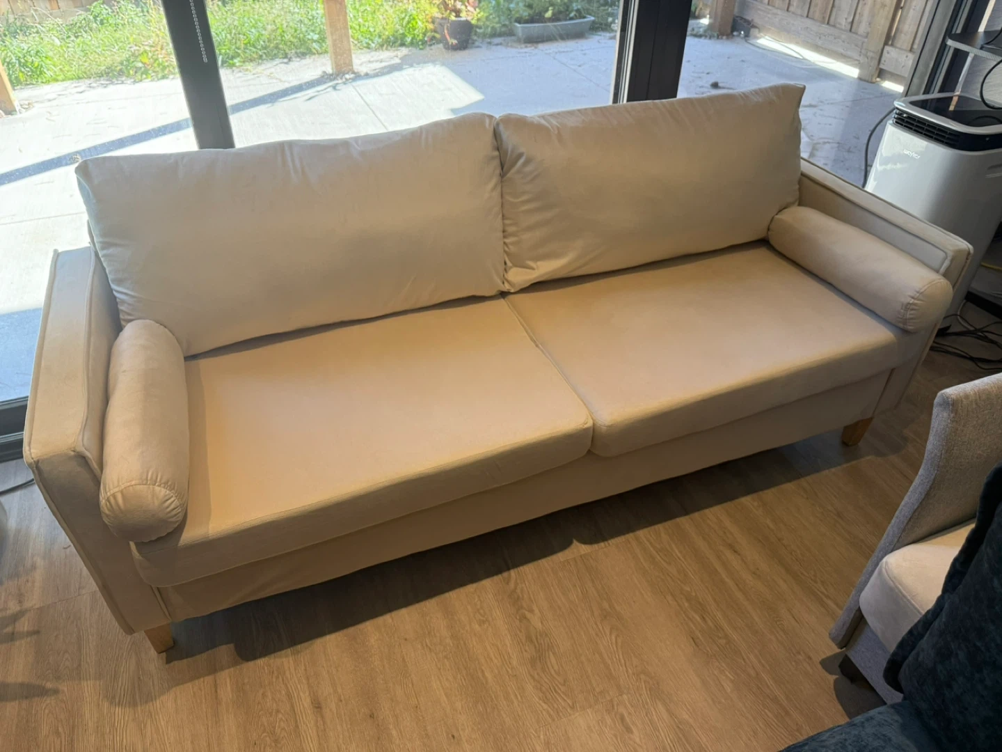 Selling a comfy beige sofa that's in great condition! It measures 61 inches wide, perfect for a smaller living space or apartment. The cushions are soft and supportive, making it a great spot to relax after a long day. The neutral colour will fit with any decor style!