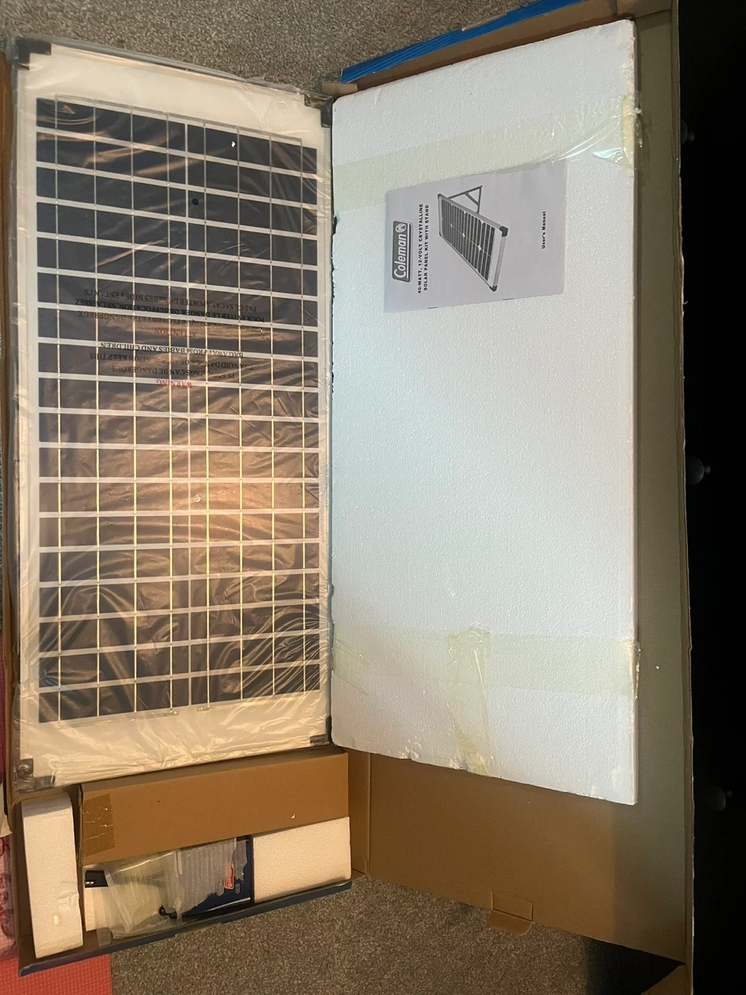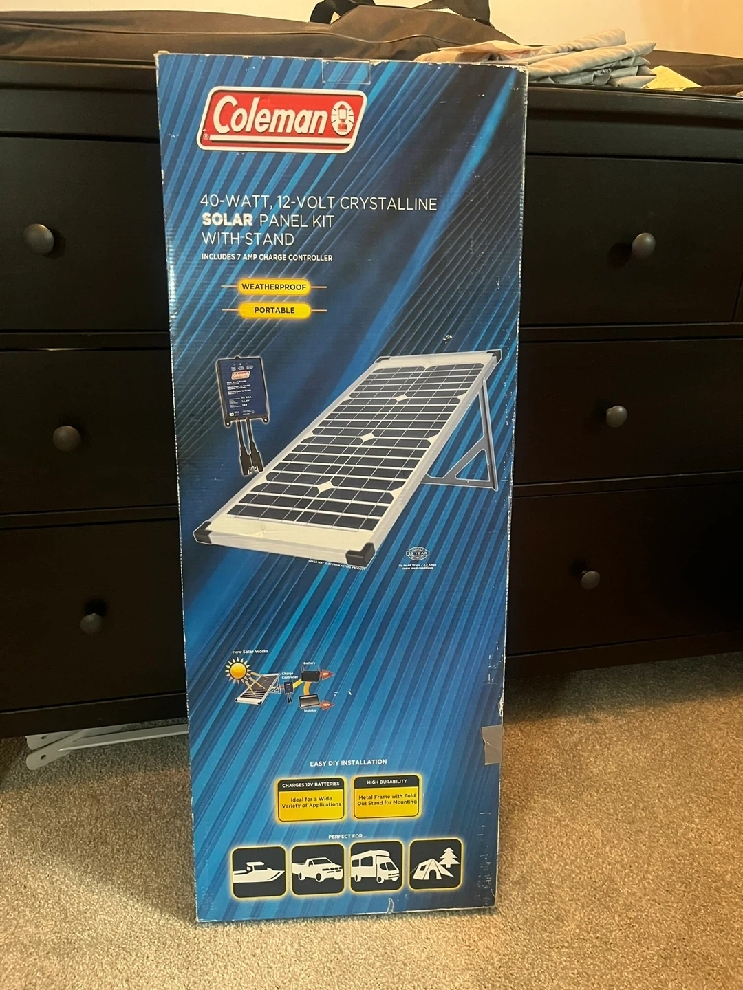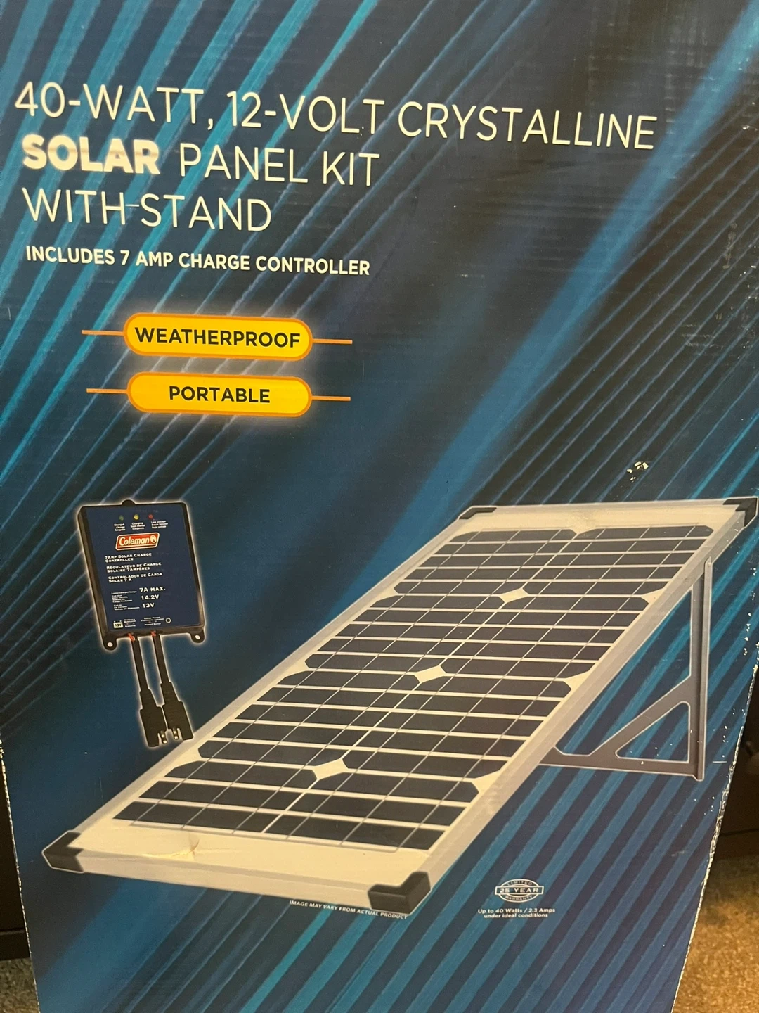 Selling a Coleman 40-Watt, 12-Volt Crystalline Solar Panel Kit with Stand! It includes a 7 amp charge controller. This kit is weatherproof and portable, making it perfect for various applications. The box is included! Originally bought for $199.99