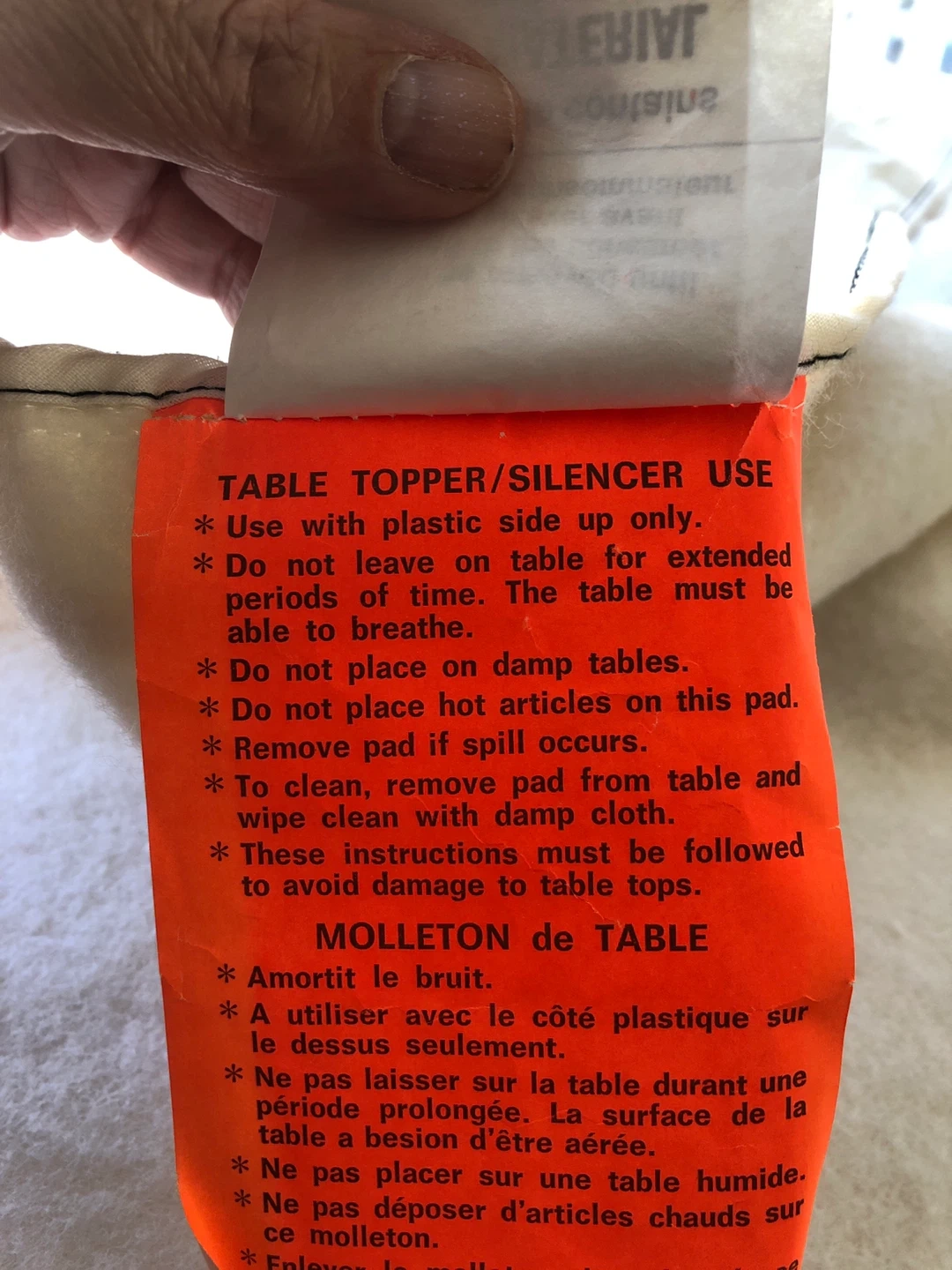 Table topper/silencer use pad for tables. It is made of 100% vinyl plastic. It is important to use with the plastic side up and not leave on tables for extended periods of time so the table can breathe. Do not place hot articles on this pad. Remove pad if spill occurs and wipe clean with damp cloth