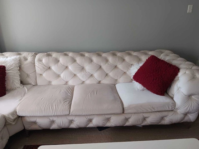 This elegant white couch features a tufted design and comfortable seating, perfect for adding a touch of sophistication to any living space. It's gently used but still in good condition. * Classic tufted detailing * Comfortable cushions * Stylish design Add a little whimsy to your home with this couch. If the ad's up, it's available! Based on similar couches I've seen , I'm pricing this at $700. Make an offer!