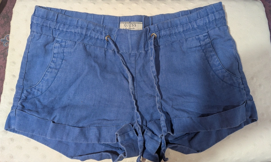 These are a cute pair of Guess shorts made from a linen blend material. They are blue and feature a drawstring waist. Perfect for a casual, comfy look!