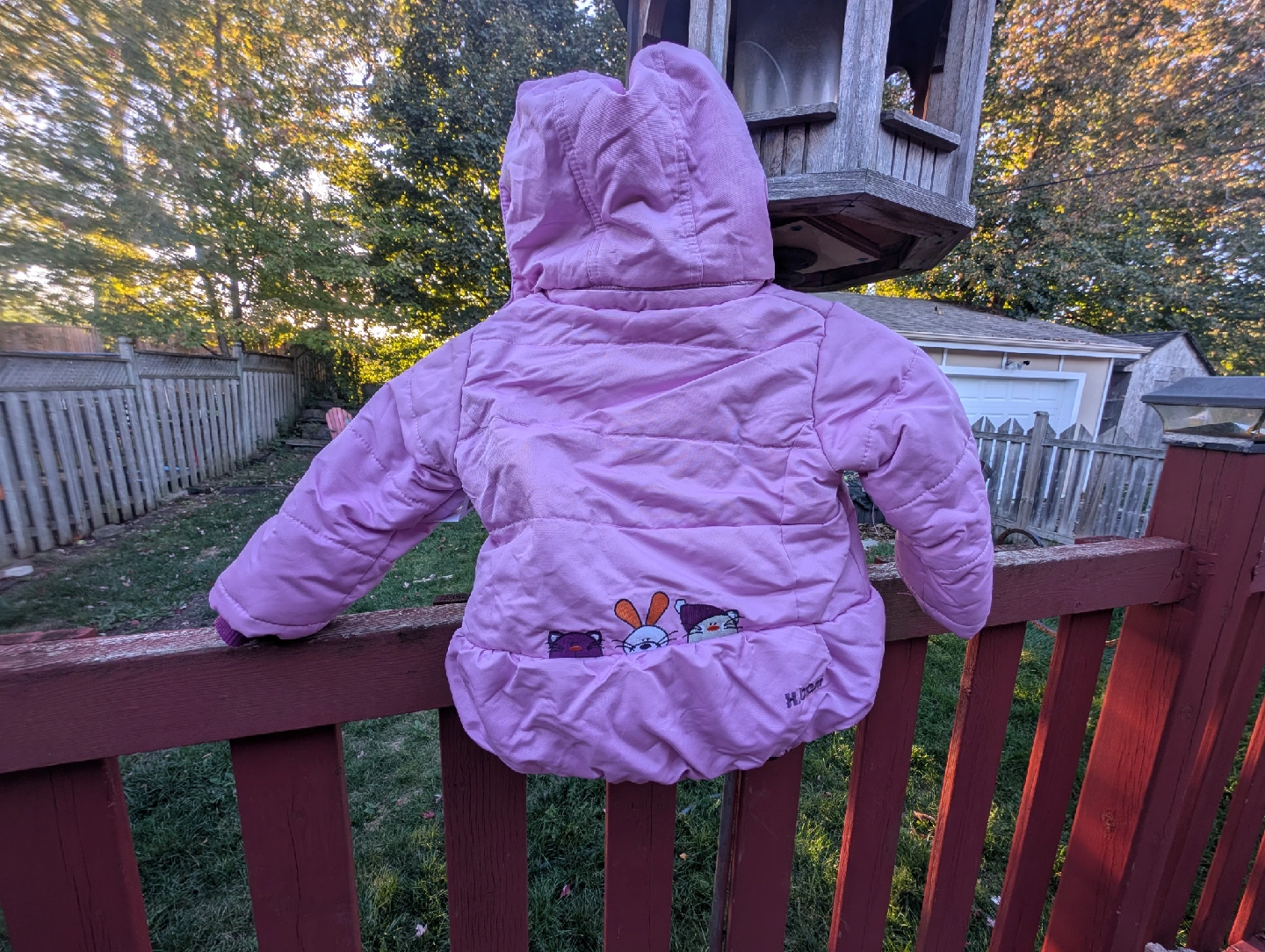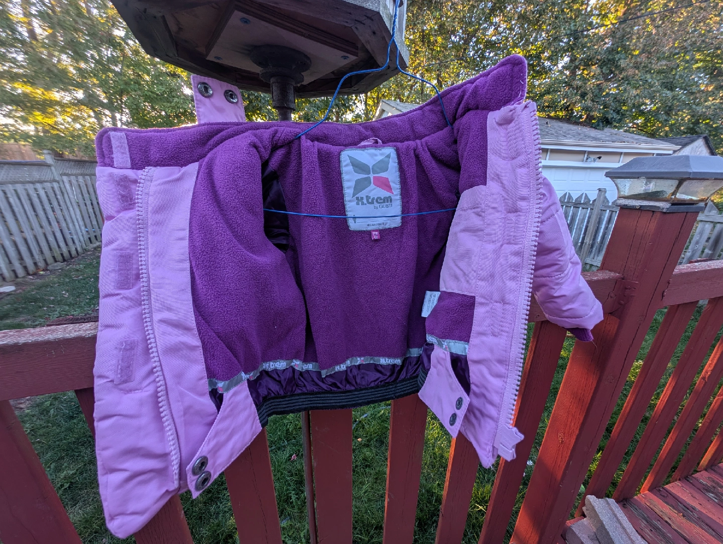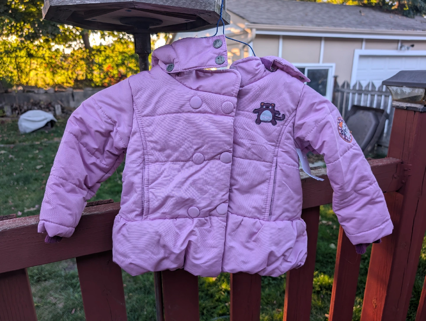 Girls size 24 months winter coat. Brand is X.Trem by Gusti, made in Canada. Velcro close pockets on outside, fleece lined inside with a small pocket. Elastic and button closure on inside to keep snow out. Hood is fleece lined and removable. Full zipper front with velcro and faux buttons.