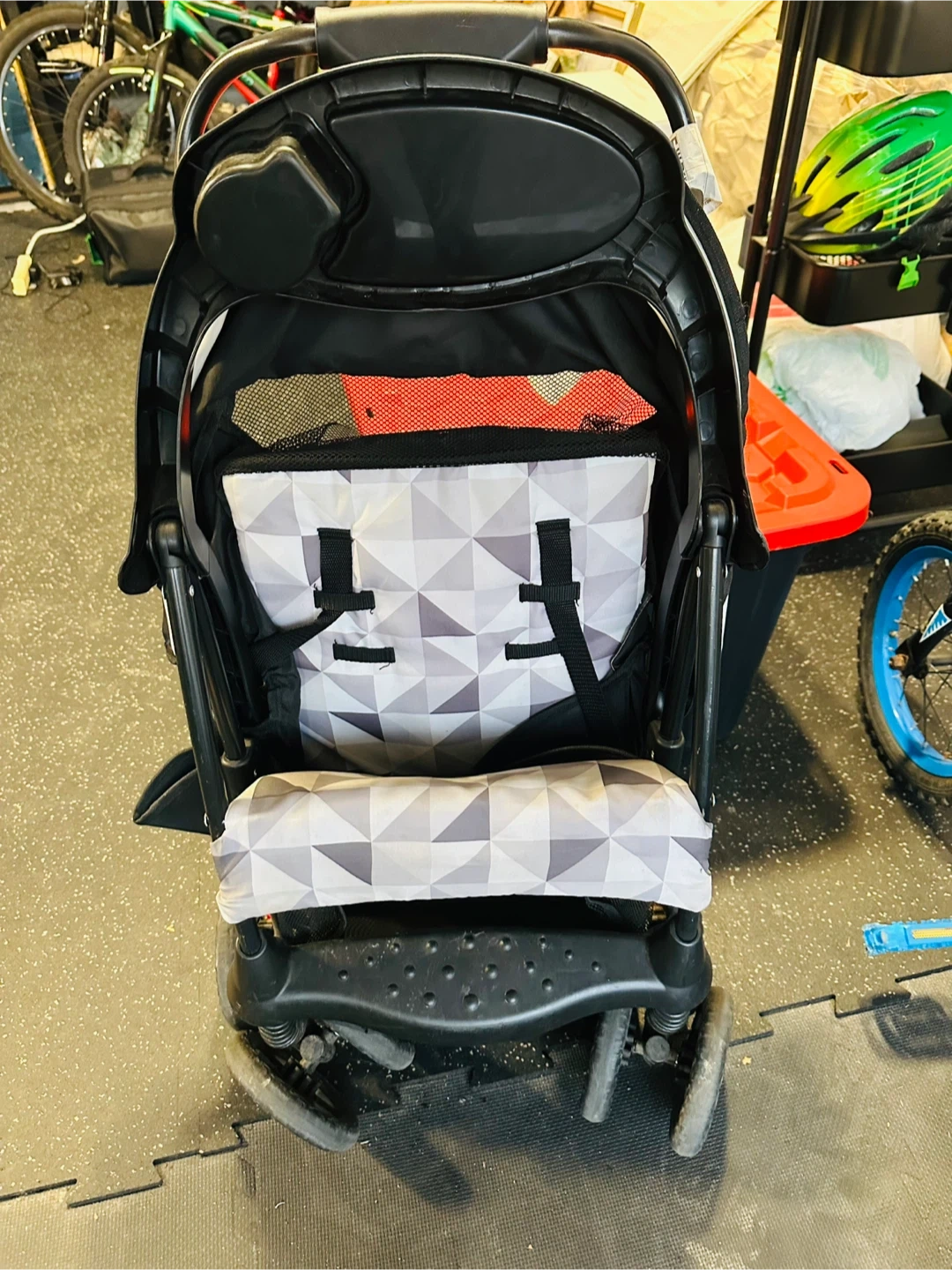 Selling a used black stroller. It has a grey and white patterned seat. Good for taking your little one on walks!