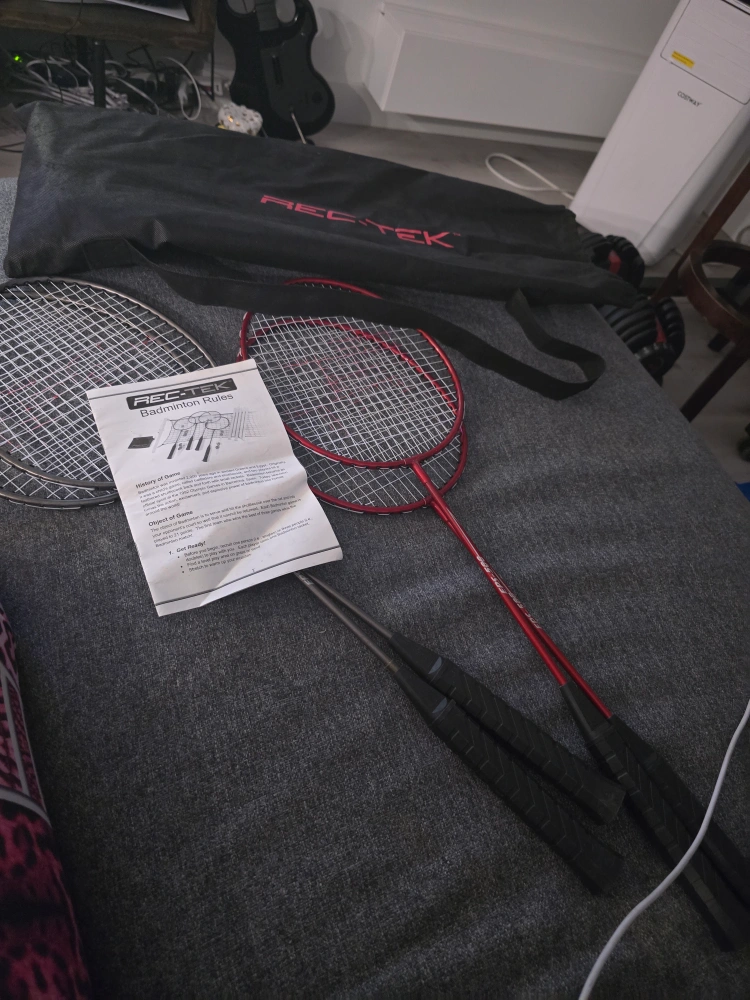 Selling a Rec-Tek badminton set. It comes with four rackets and a carrying bag. has instructions but no net. tgeres some old shuttlecocks too but id recommend buying a new one! rackets are like new