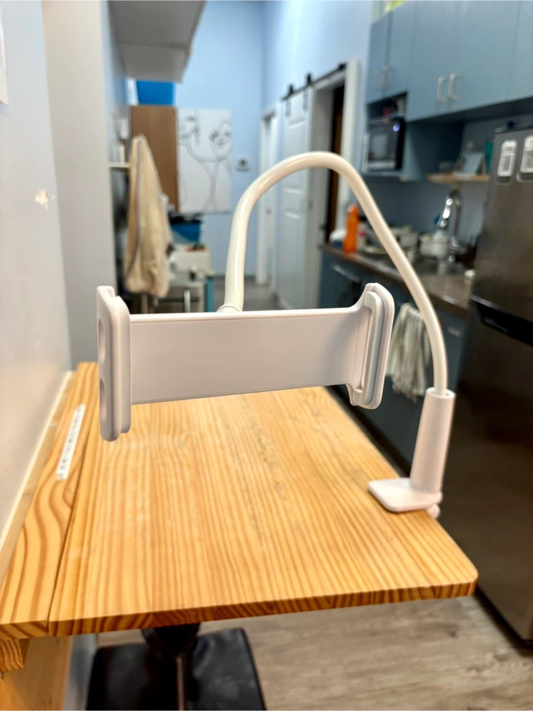 Selling a white flexible iPad holder! It's in great condition and perfect for hands-free use while watching videos, video calling, or following recipes. It can be easily attached to a desk or table.