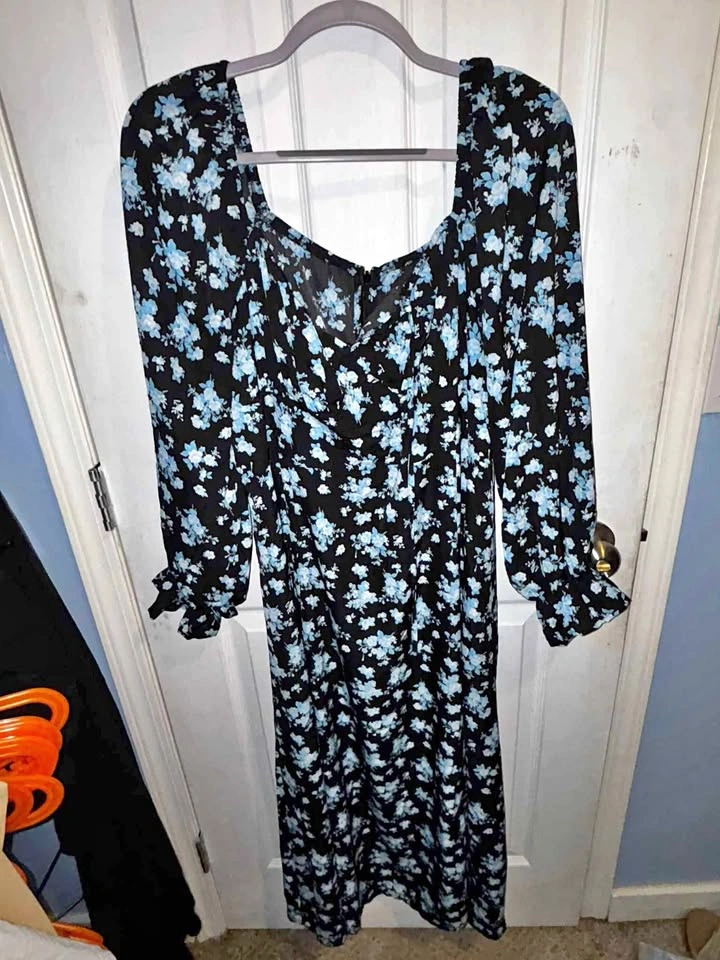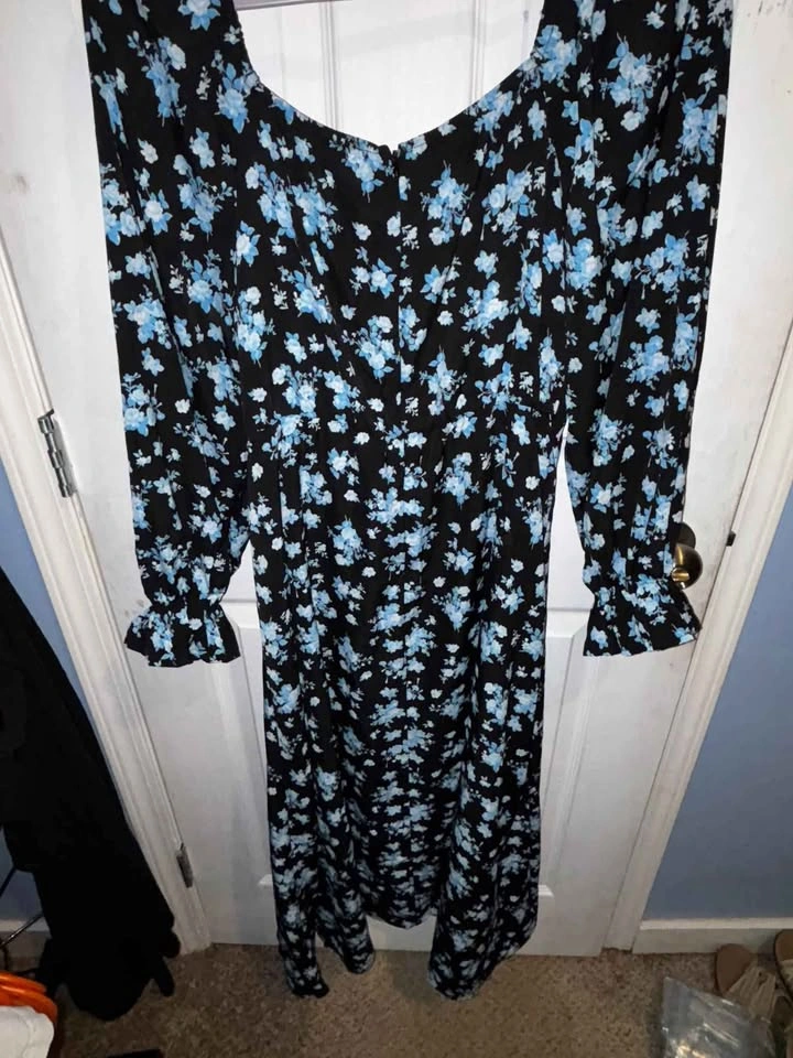 Style: Elegant maxi dress with long sleeves Black base with blue floral print 🌸 Features ruffle cuffs and a flattering waistline Perfect for casual outings, parties, or layering with boots & jackets Condition: Excellent / new ✅ 💲 $29 📍 Pickup in Mission Please also check my other listings for more great clothing & deals under #TinyPriceMission
