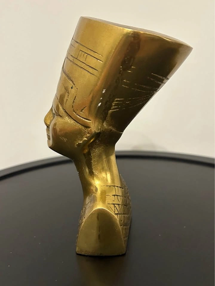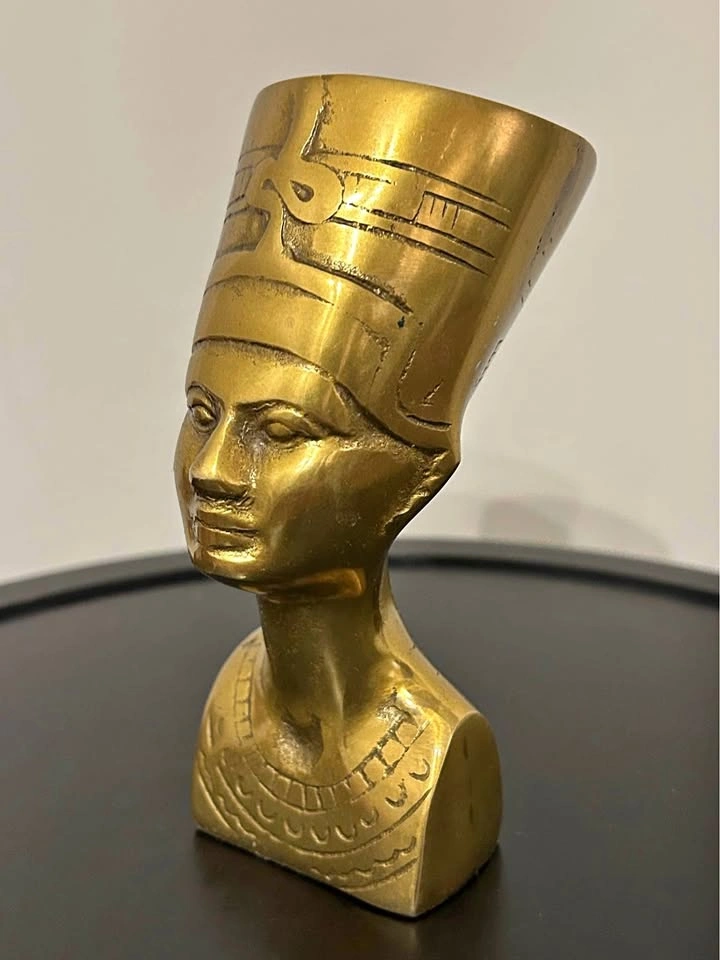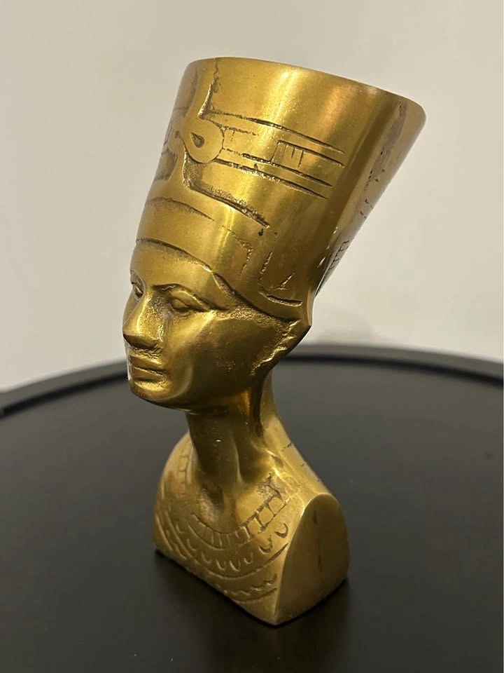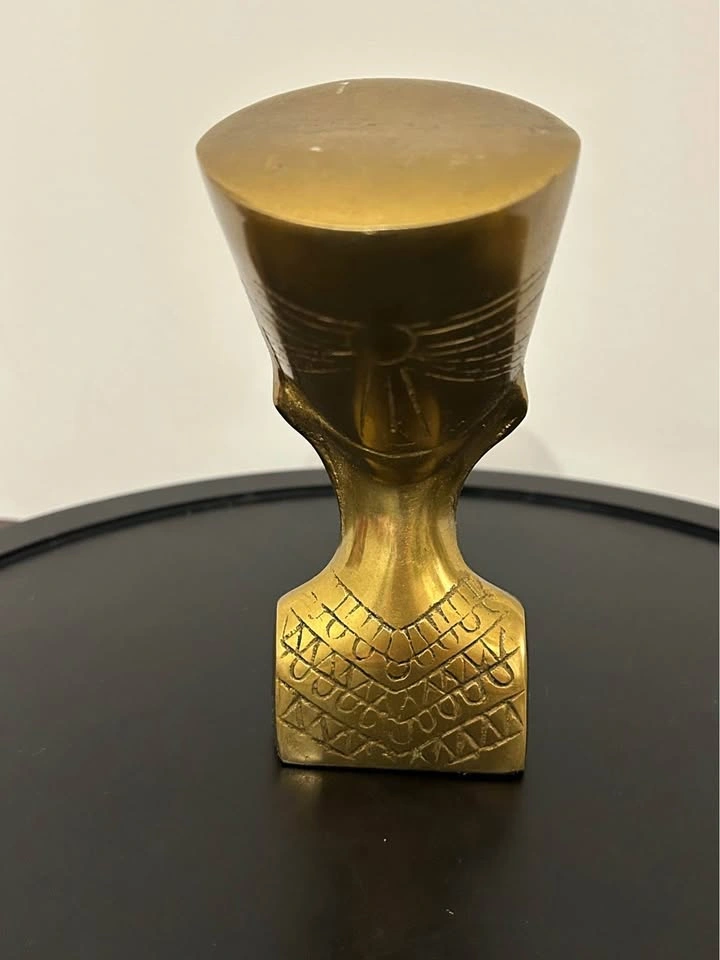 Vintage brass bust of Queen Nefertiti, measuring approx. 5.5” tall. Made in Korea, likely 1970s–1980s souvenir piece inspired by Egyptian Revival style. Solid metal with golden finish, showing some age-related wear. A decorative collectible for lovers of Egyptian art and history. Pick up: Seton area, Calgary. See also my other lots. Open to your questions and suggestions. If necessary, I provide additional photos. These are not new things, so please look carefully at the photos and videos. Sizes are submitted on request and also using a tape measure in the photo.