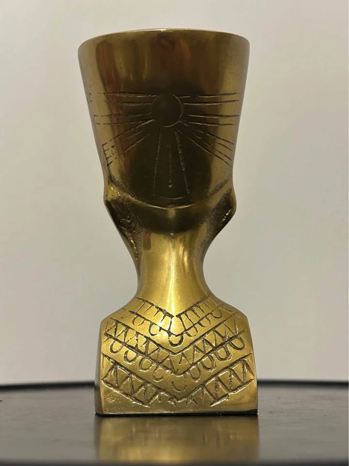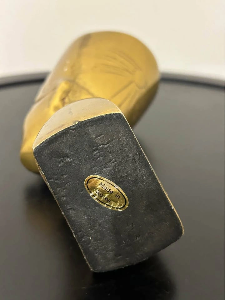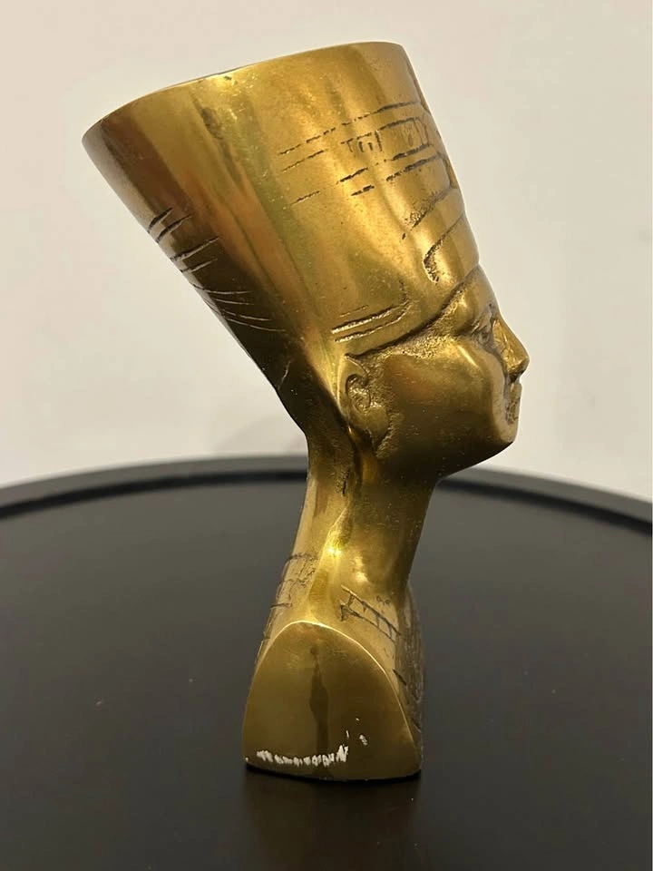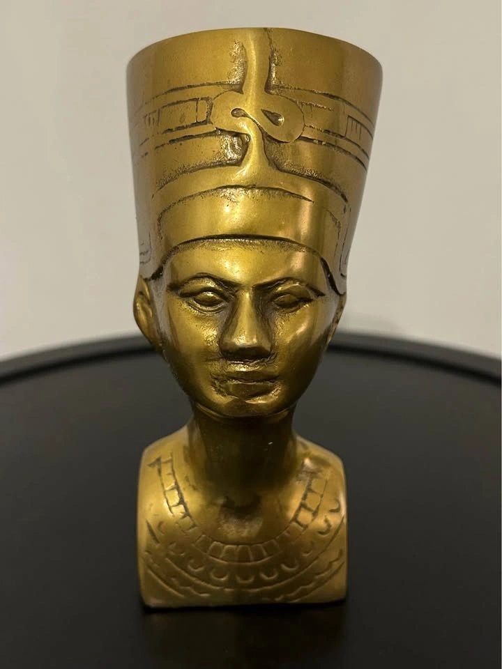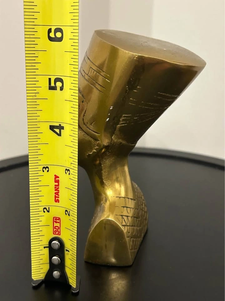 Vintage brass bust of Queen Nefertiti, measuring approx. 5.5” tall. Made in Korea, likely 1970s–1980s souvenir piece inspired by Egyptian Revival style. Solid metal with golden finish, showing some age-related wear. A decorative collectible for lovers of Egyptian art and history. Pick up: Seton area, Calgary. See also my other lots. Open to your questions and suggestions. If necessary, I provide additional photos. These are not new things, so please look carefully at the photos and videos. Sizes are submitted on request and also using a tape measure in the photo.