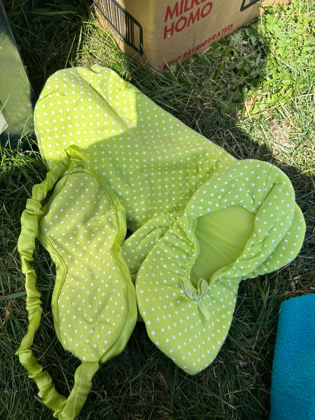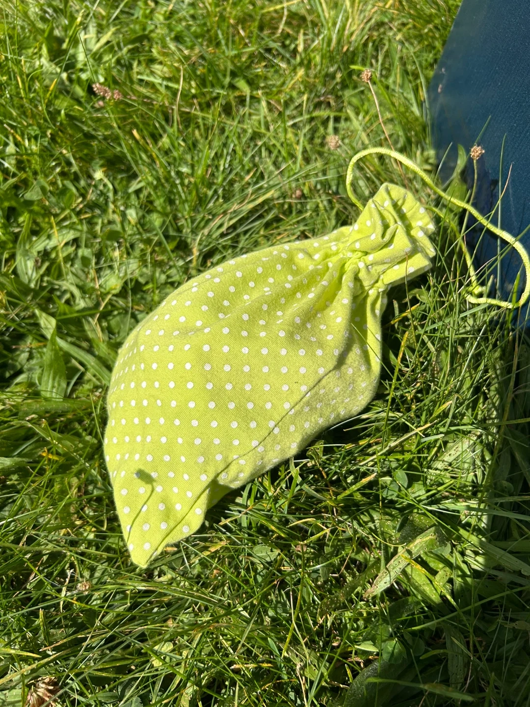 This is a green polka dot travel set with a bag, eye mask, and slippers. It's lightweight and portable, perfect for your next trip!