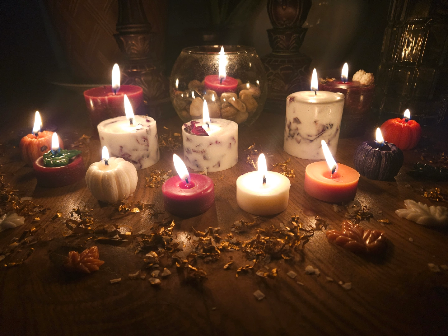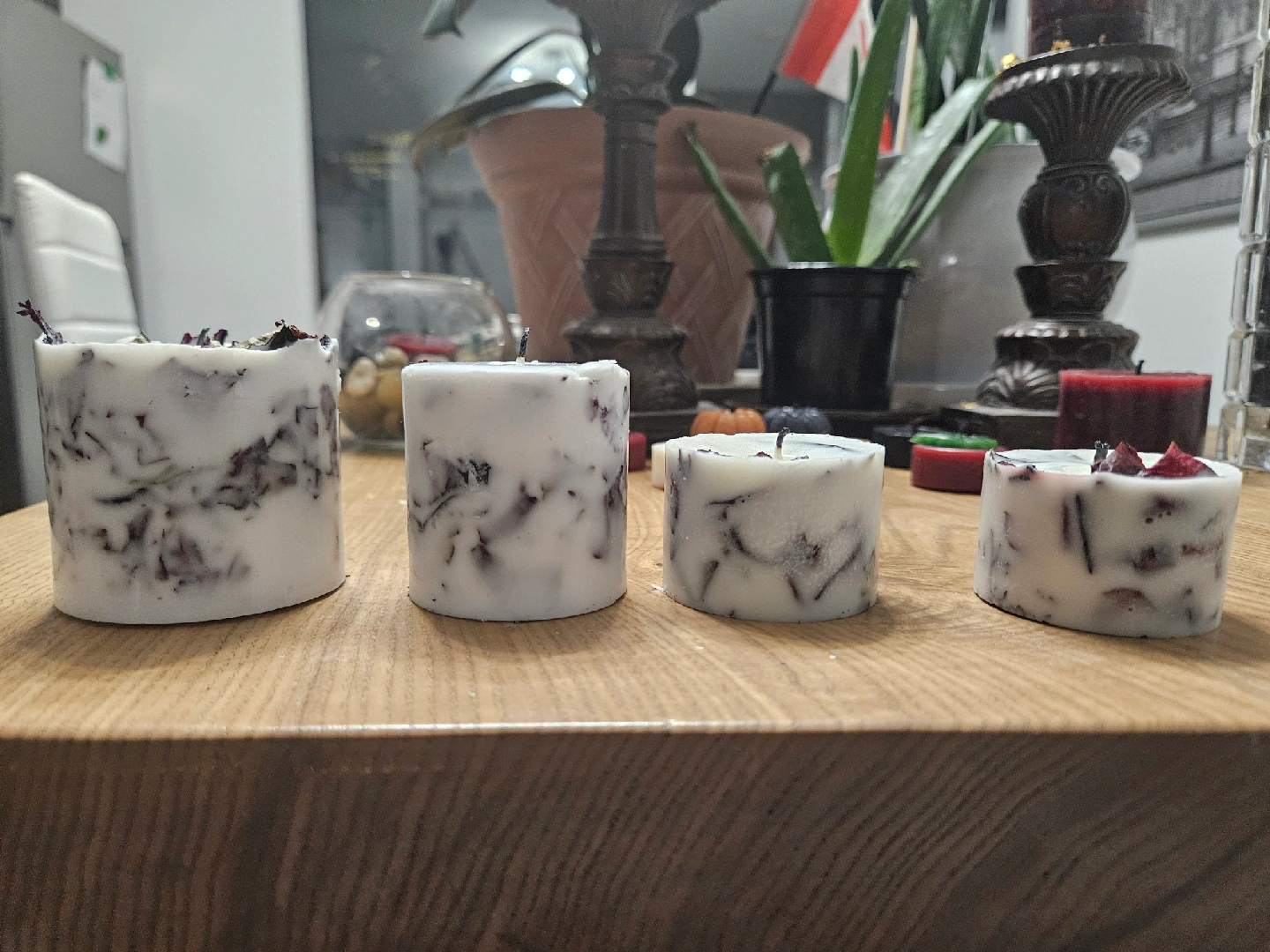 A variety of decorative candles that are recycled from other candles. Prices vary on size and quantity. Larger candles have rose petals embedded in them. Package of 6 tealight regular - $7.00 Package of 6 pumpkin shaped - $9.00 Large white/red candle - $15.00 Medium white/red candle - $12.00 Small white/red candle - $10.00