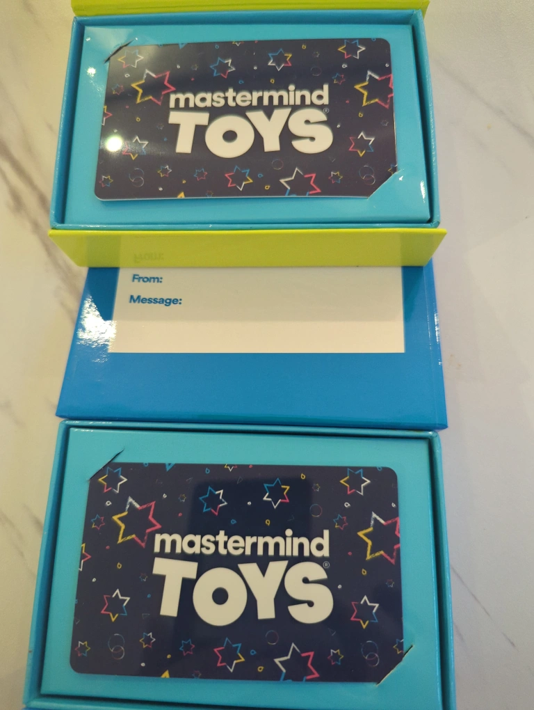 Selling a Mastermind Toys giftcard! It comes in its original packaging, perfect for gifting or treating yourself. It's ready to bring joy to any toy lover! 2 cards 50.00 value..