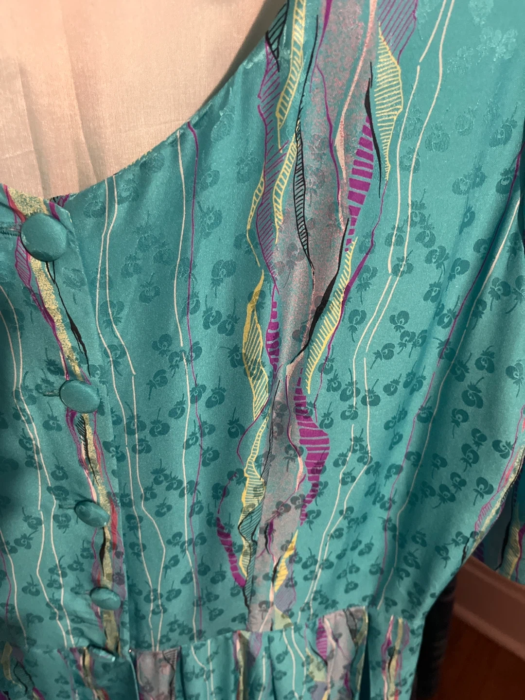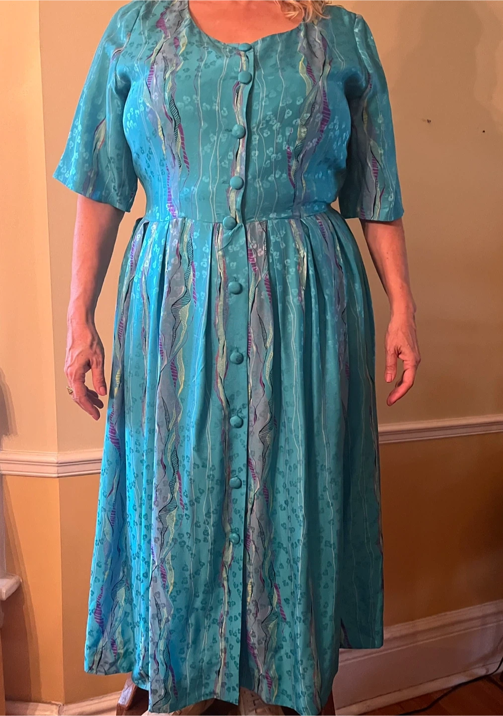 Beautiful vintage silk, fully lined, dress. It features a button-down front and a flattering silhouette. Perfect for adding a touch of retro charm to your wardrobe