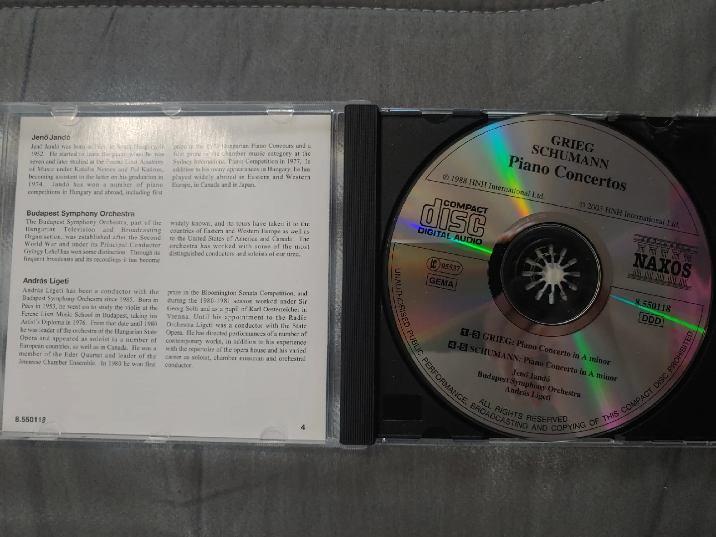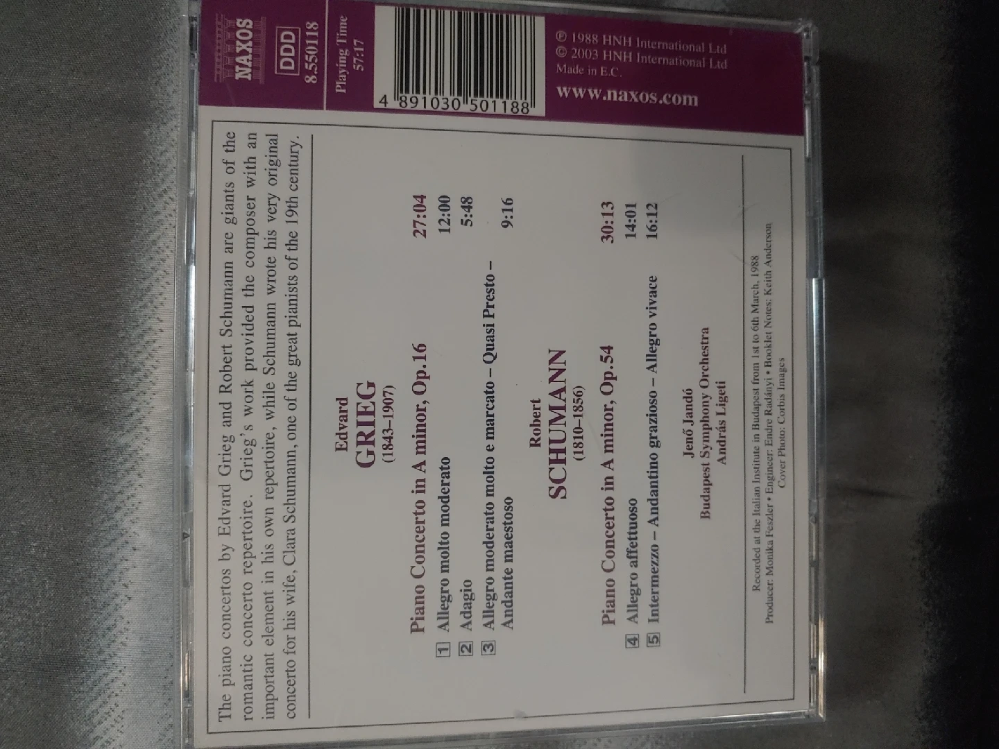 Selling a CD featuring Grieg and Schumann's Piano Concertos. It includes performances by Jenő Jandó with the Budapest Symphony Orchestra, conducted by András Ligeti. A great addition for classical music enthusiasts!