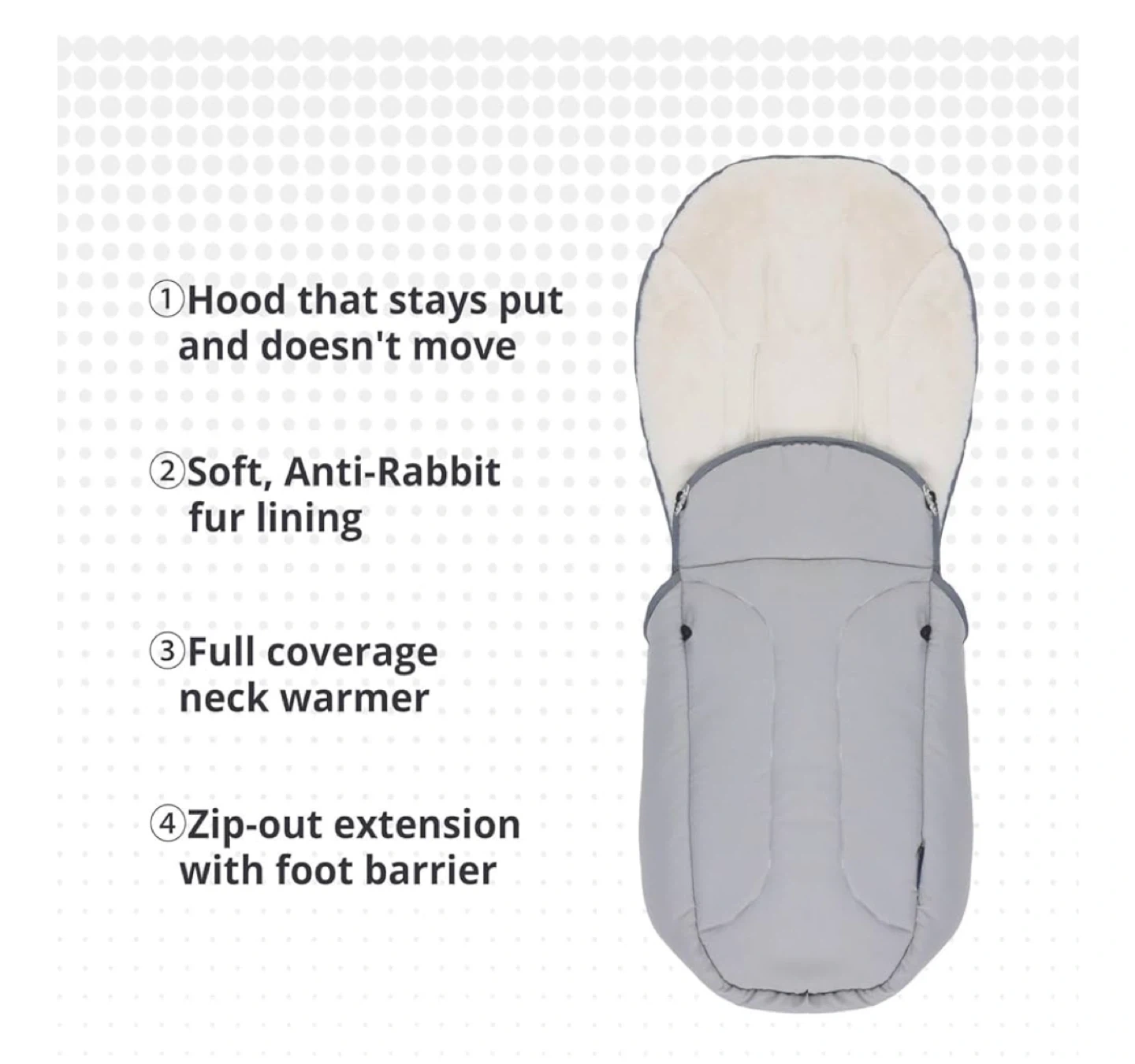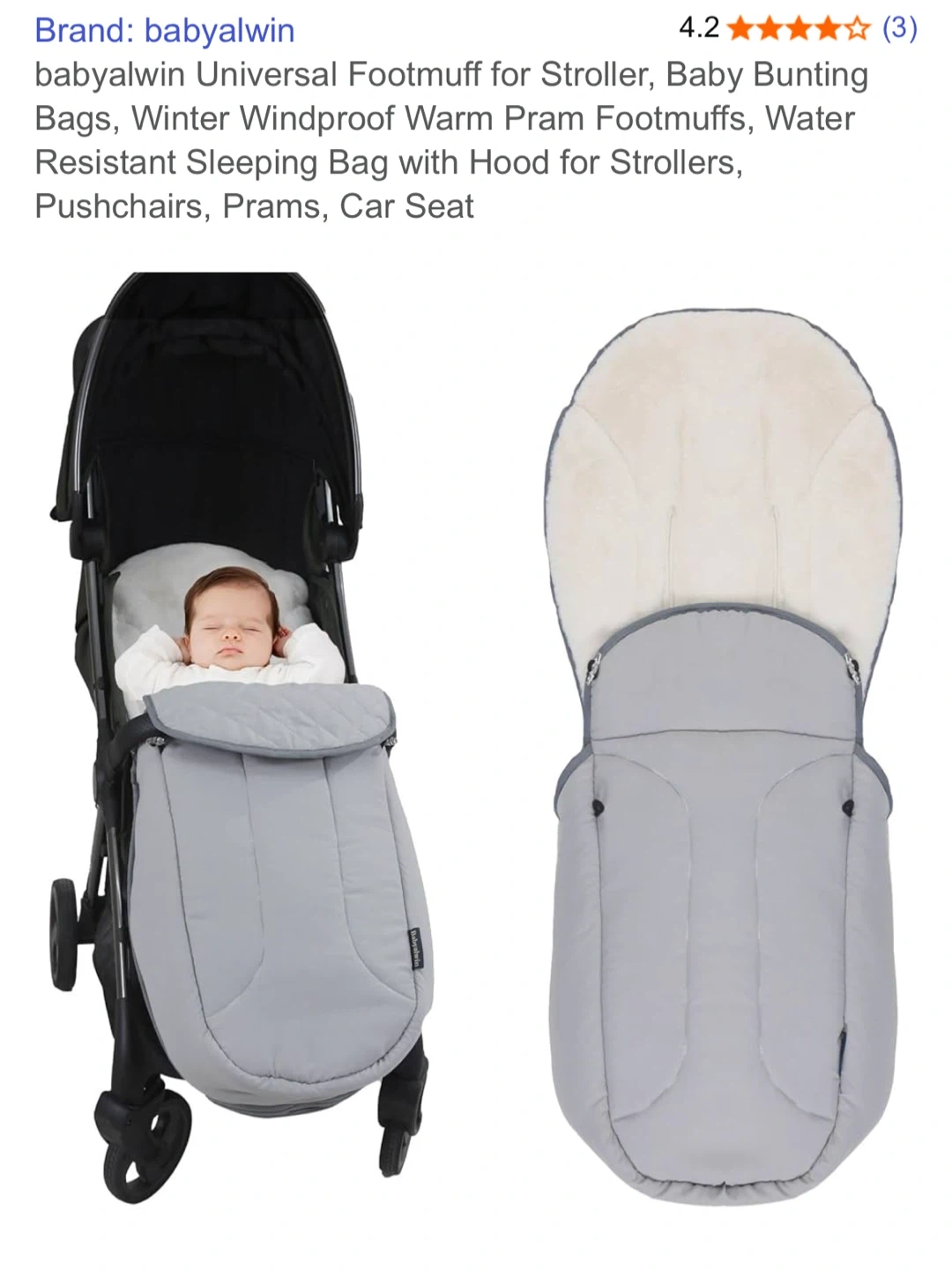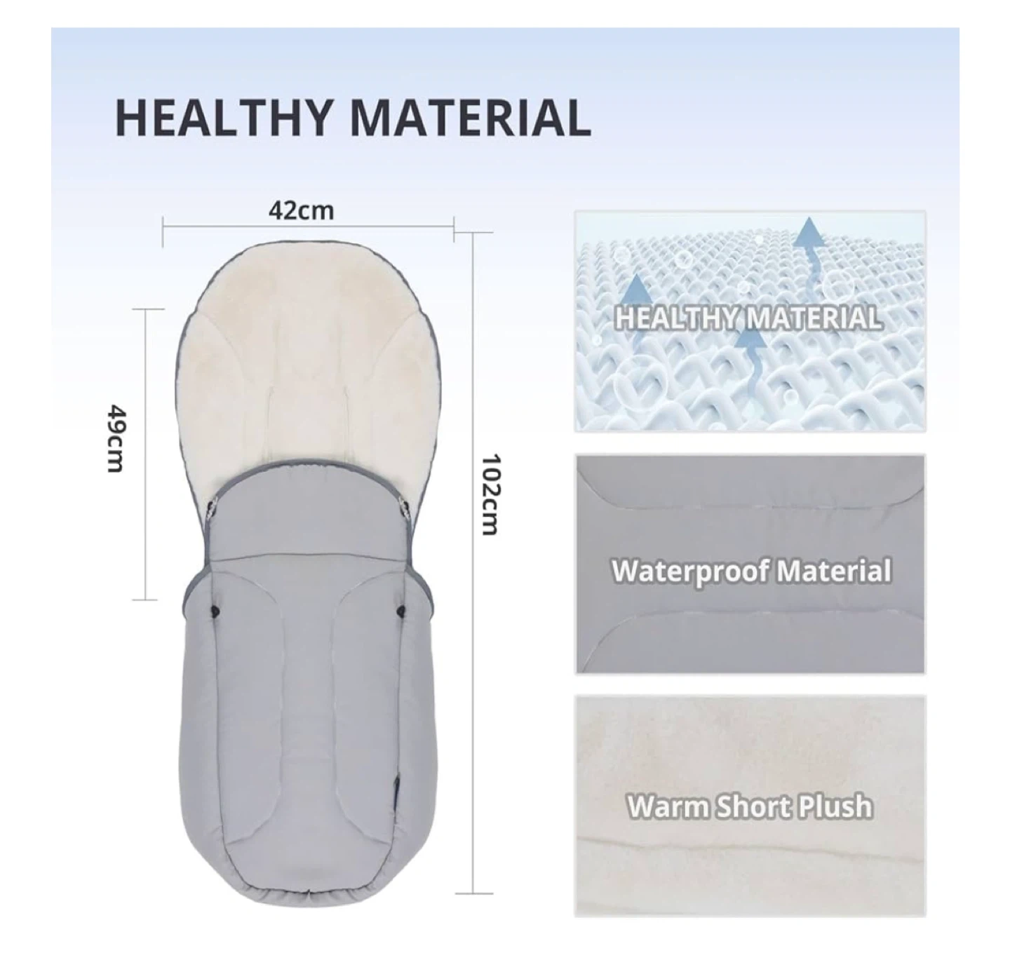 Keep your little one warm and cozy with this babyalwin universal footmuff for strollers! - Designed to fit most strollers, pushchairs, prams, and car seats - Made with waterproof material and warm short plush lining - Features a hood that stays put, soft anti-rabbit fur lining, and a full coverage neck warmer - Simple installation with side zippers and buckles - Dimensions: 42cm x 49cm x 102cm