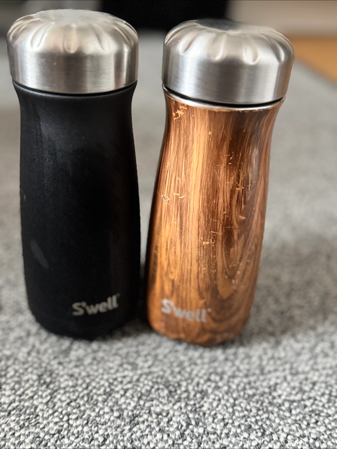 Selling two S'well water bottles! One is a sleek black, and the other has a nice woodgrain pattern. They're both in good condition and ready to keep your drinks cold or hot!